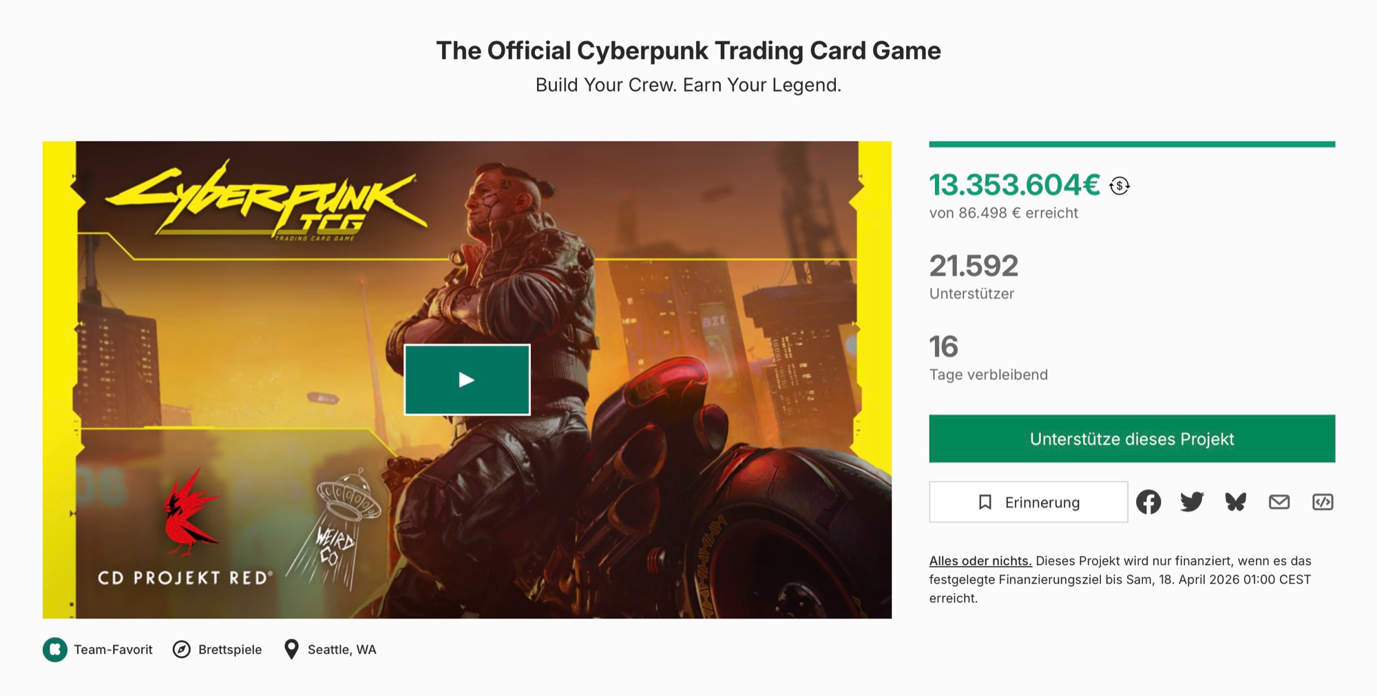 O jogo conseguiu arrecadar mais de uS$ 15,4 milhões de mais de 21.500 clientes. Isso significa que o Cyberpunk TCG superou até mesmo a maioria dos videogamescom exceção do Star Citizen, que já arrecadou quase um bilhão de dólares americanos. A WeirdCo atribui esse sucesso não apenas à força da marca Cyberpunk, mas, acima de tudo, à estreita cooperação com a comunidade, que se reflete em pesquisas semanais que influenciam o roteiro do jogo