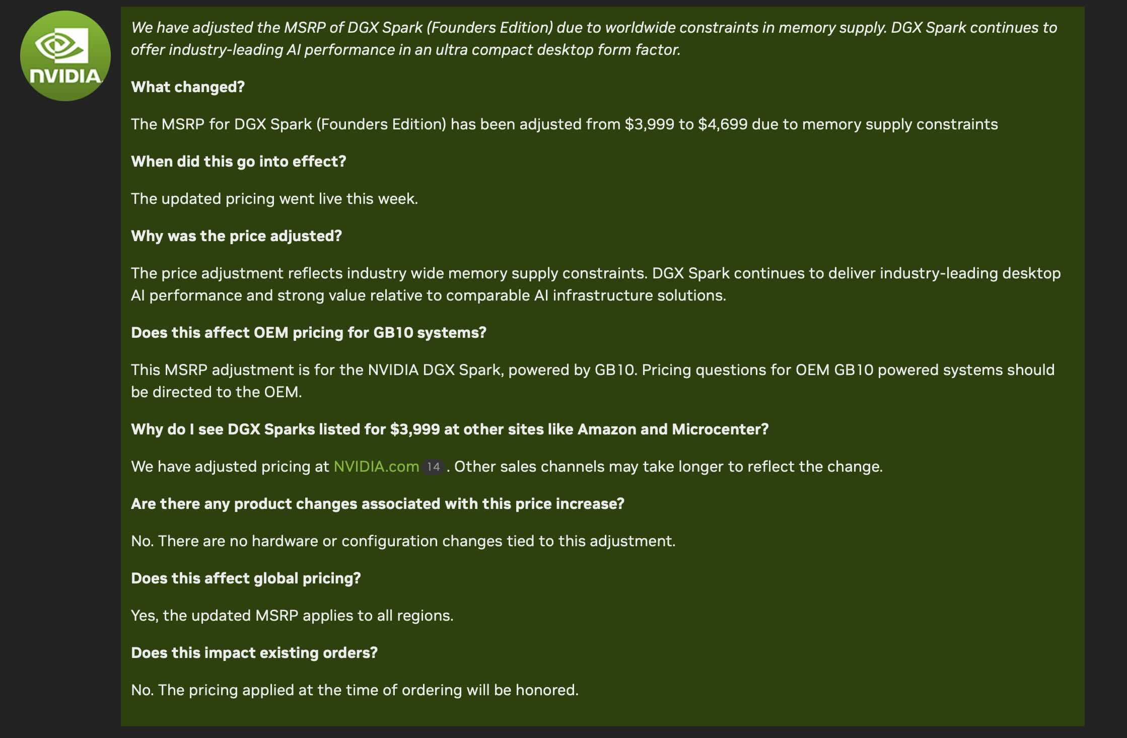 Obviamente, o mini PC para estação de trabalho está longe de ser um sistema acessível e foi lançado com um preço sugerido de US$ 3.999. Em uma declaração recente, no entanto, a empresa revelou que o preço do sistema aumentará em US$ 700, elevando seu preço de venda para US$ 4.699. A Nvidia atribui o aumento maciço à disparada dos custos de DRAM e armazenamento, o que não é uma surpresa.