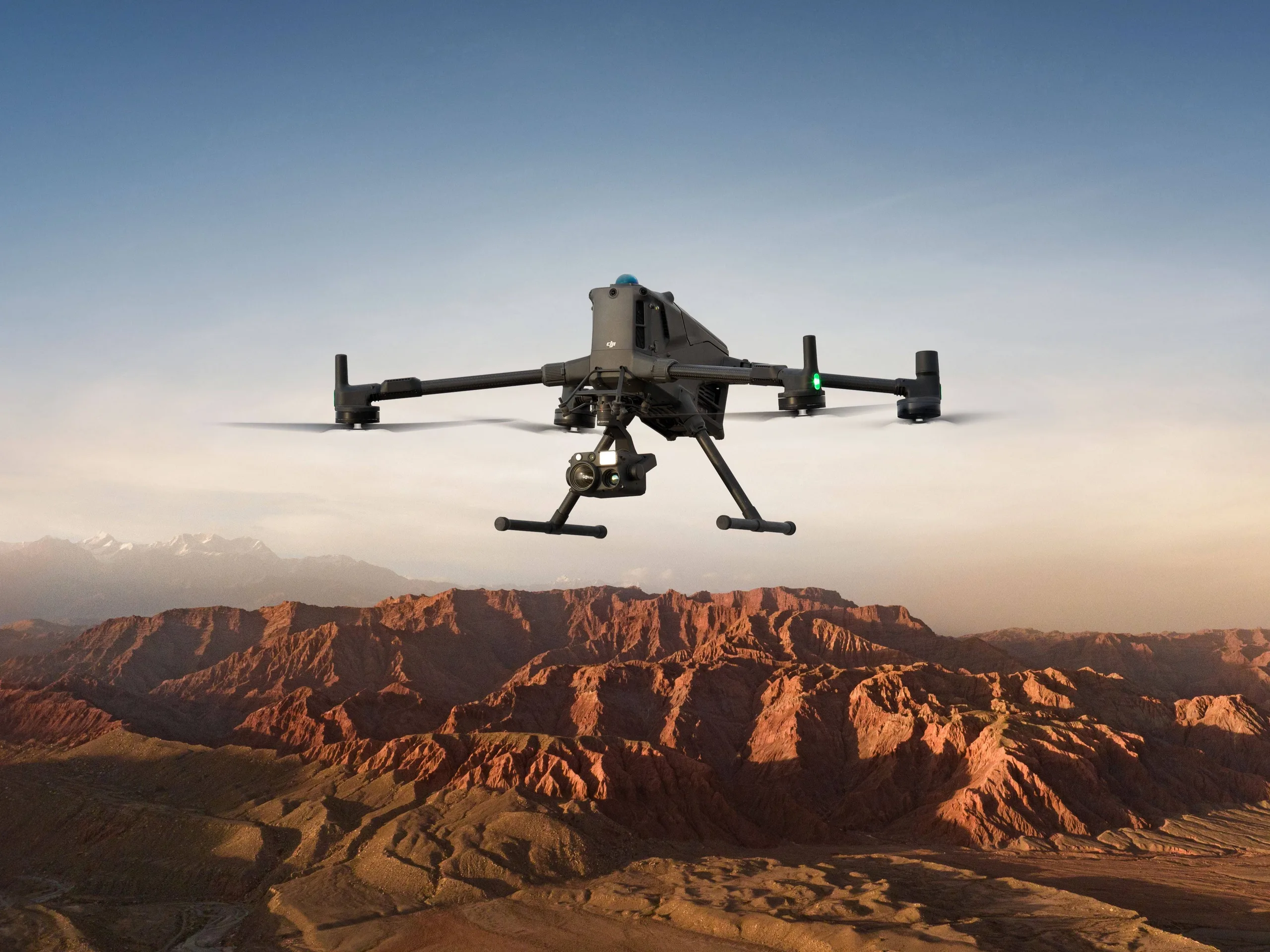 Esses são apenas três exemplos de uma lista muito mais ampla de possíveis cargas úteis. Além disso, o Matrice 400 é equipado com um potente LiDAR, um radar mmWave e sensores de visão fisheye coloridos de baixa luminosidade, o que lhe permite discernir objetos menores, como linhas de alta tensão em uma cadeia de montanhas à noite. O conteúdo da imagem é supostamente transmitido a distâncias de até 40 quilômetros por meio do sistema O4 Enterprise Enhanced, e também é possível usar um drone como retransmissor para a transmissão, o que pode ser útil em áreas urbanas.