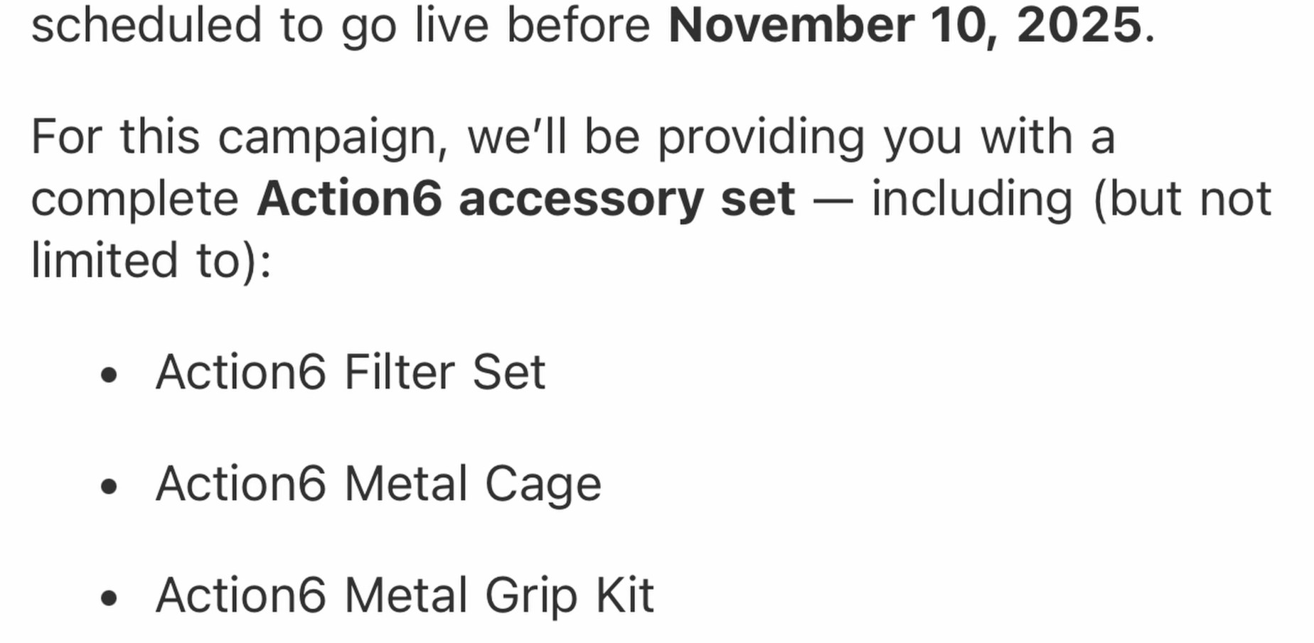 Inédita em uma câmera de ação, essa abertura variável será acompanhada por uma bateria de 1.950 mAh que, segundo as estimativas, fornecerá até 4 horas de duração. Há rumores de que todo esse hardware custará a partir de aproximadamente US$ 329 nos EUA. De acordo com o site The New Cameraalgo relacionado ao Osmo Action 6 está "programado para ir ao ar antes de 10 de novembro de 2025". Portanto, é razoável esperar que a DJI apresente oficialmente o Osmo Action 6 no início do próximo mês.