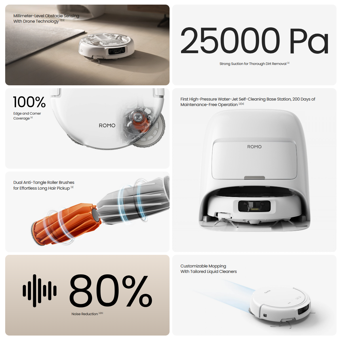 As especificações de limpeza são bastante impressionantes para uma unidade de consumo. A Romo anuncia uma sucção de até 25.000 Pa e um fluxo de ar de 20 L/s, dois motores de rolo de alta velocidade para o controle de pelos e um tanque de água integrado de 164 ml que ajusta o fluxo automaticamente. Os braços laterais duplos e flexíveis se estendem para alcançar os cantos e se adaptam em tempo real, enquanto o controle adaptativo da escova reduz a propagação de detritos ao encontrar lixo, como o de gatos. A DJI também incluiu uma base de lavagem automática: quatro bicos de alta pressão, uma grande saída de resíduos de 16 mm e uma força descendente de 12 N nas almofadas, que, segundo a empresa, pode reduzir a manutenção das almofadas para até 200 dias em condições de teste.