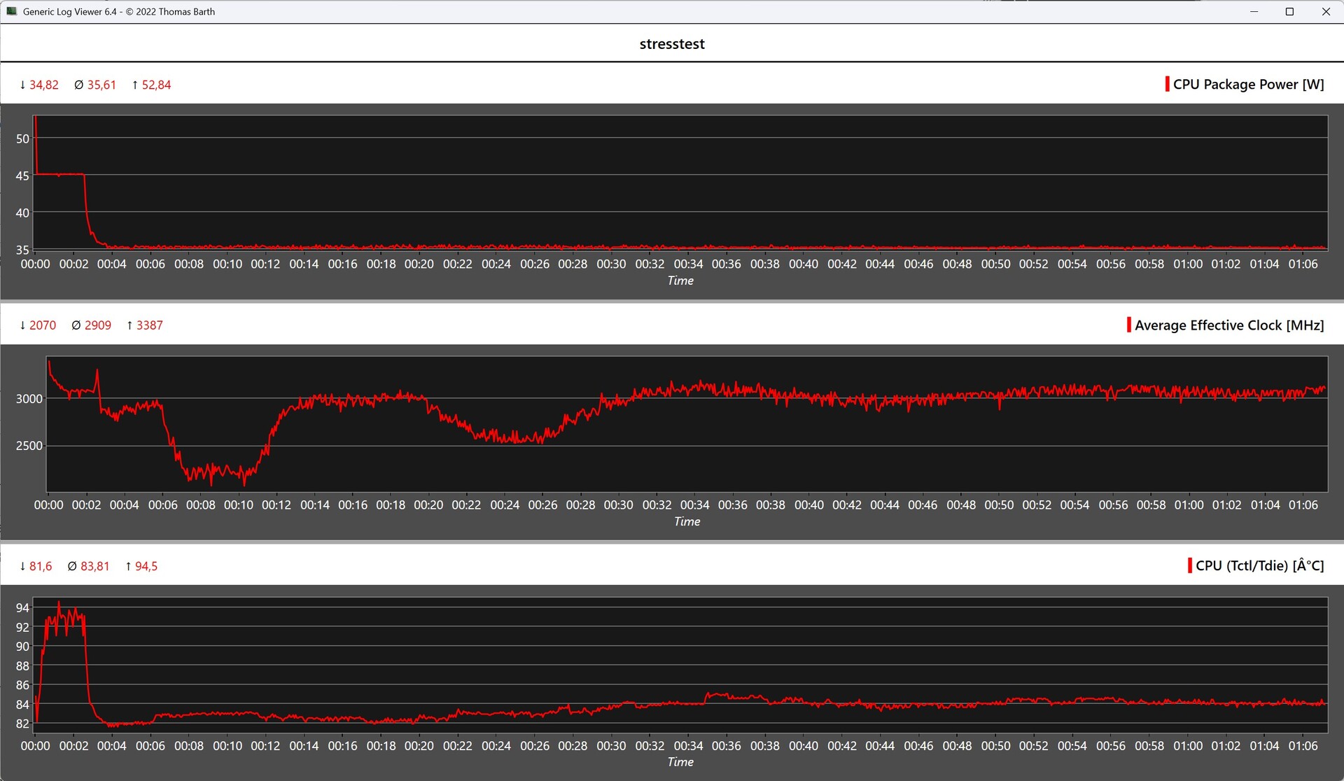 Graças ao seu sofisticado design de resfriamento, a carcaça do Alliwava H90 Pro permanece predominantemente fria, mesmo sob alta carga. Somente na área das aberturas de ventilação traseiras há um aquecimento perceptível. No teste de estresse, o AMD Ryzen 7 8745HS atinge brevemente temperaturas de cerca de 94 C, mas isso ainda está dentro da faixa de segurança. O consumo médio de energia da APU é de cerca de 35 watts.