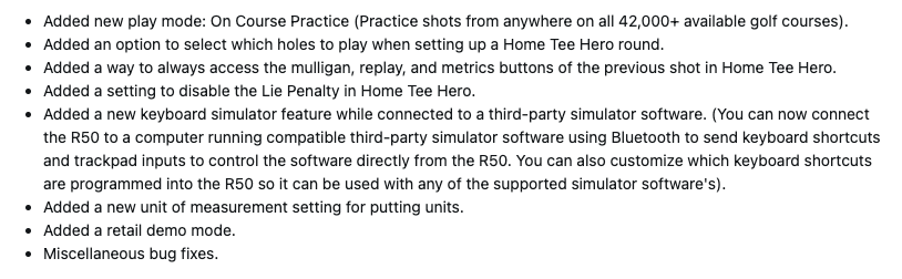 Com a versão 4.80 do software, os usuários do Approach R50 ganham uma série de novos recursos. Há um novo modo de jogo, On Course Practice, que permite que o usuário experimente várias tacadas em mais de 42.000 campos de golfe. Os usuários agora podem selecionar qual buraco jogar durante uma rodada do Home Tee Hero, e é possível desativar o Lie Penalty nesse modo. Além disso, os usuários agora podem acessar os botões mulligan, replay e métricas da tacada anterior no Home Tee Hero.