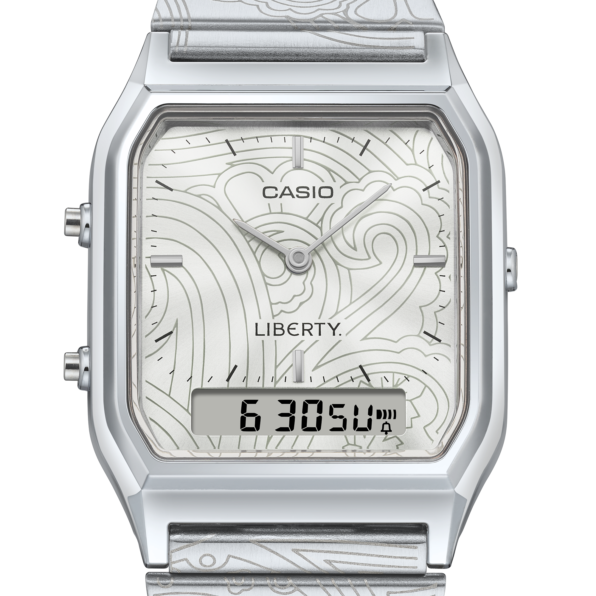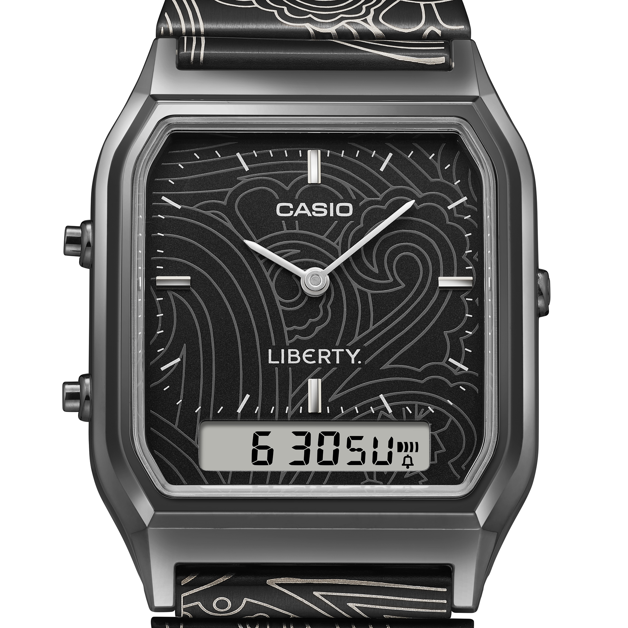 Os relógios Vintage x Liberty da Casio apresentam a icônica estampa Paisley Fanfare da marca britânica gravada a laser no mostrador e na pulseira. Cada um tem uma caixa de resina banhada, medindo 38,8 x 29,8 x 8,1 mm (~1,5 x 1,2 x 0,3 polegadas), e vem com uma pulseira de aço inoxidável. Ele deve funcionar por cerca de três anos com a bateria e também é comercializado como resistente à água.