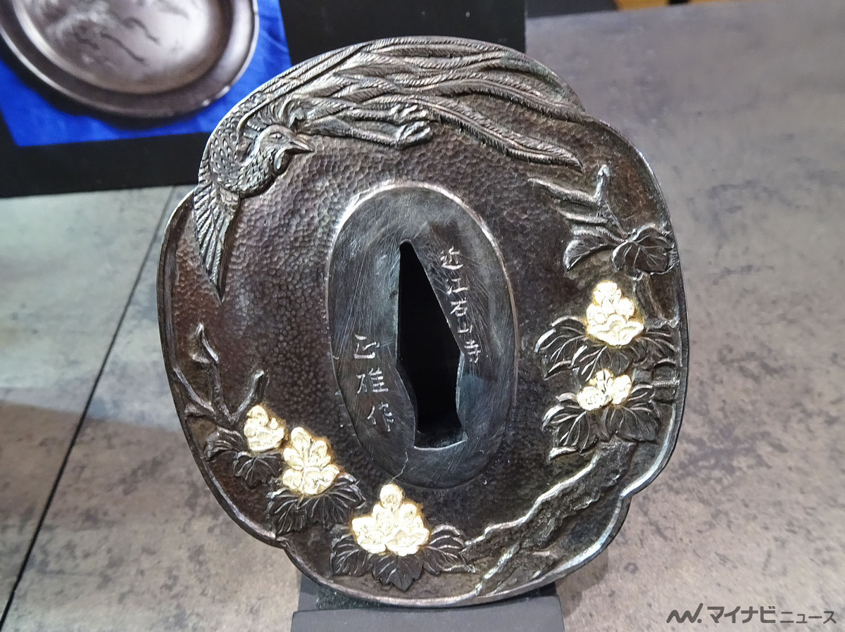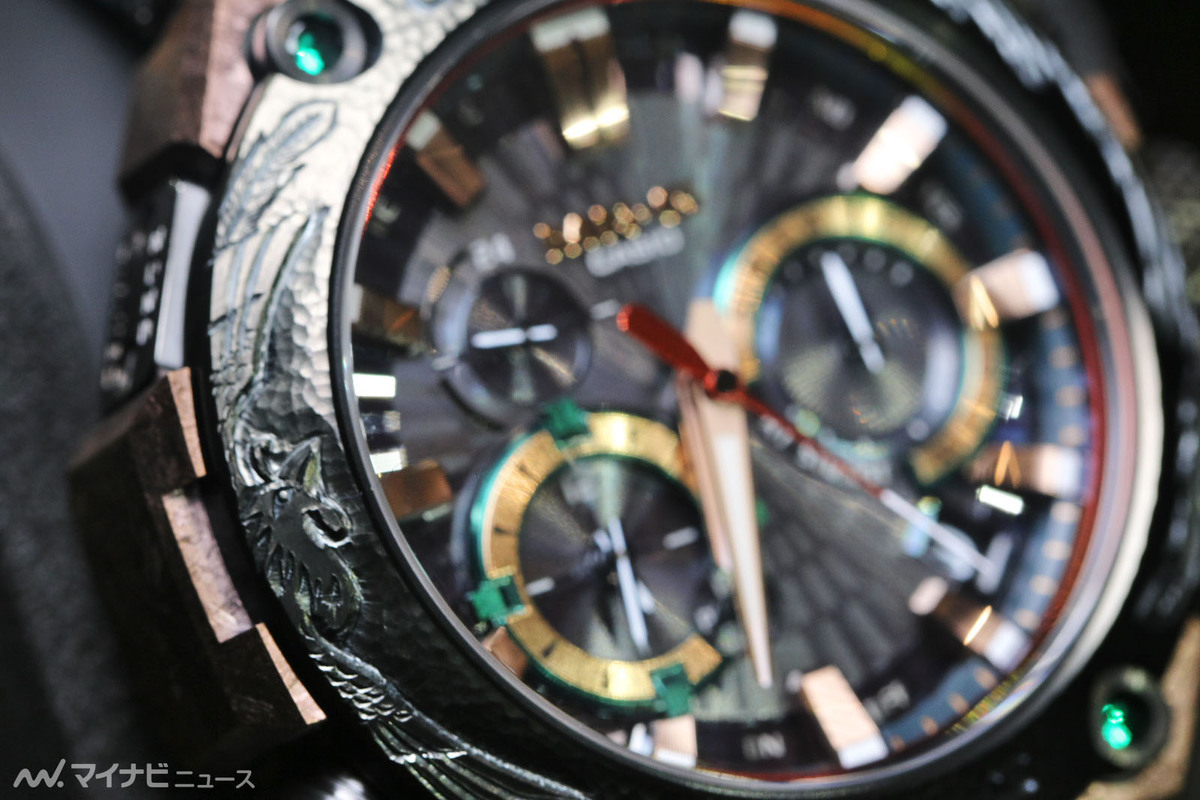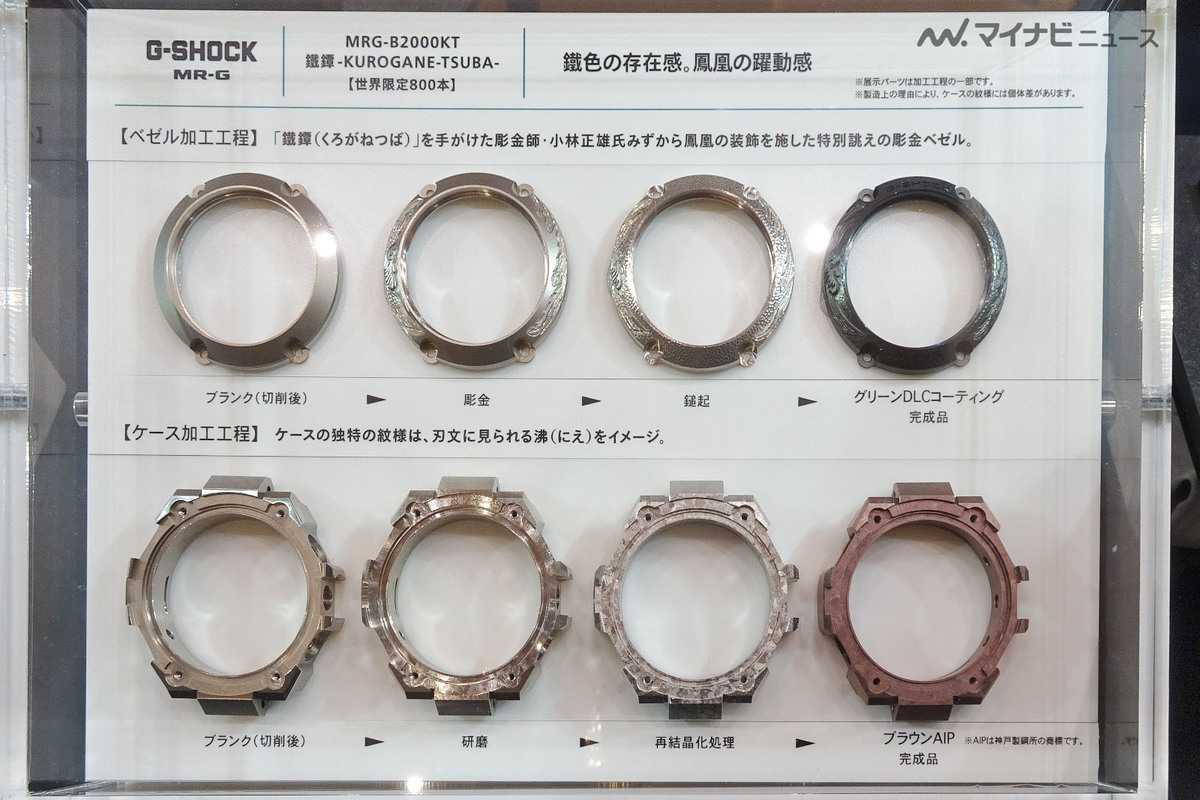 Os detalhes da coroa texturizada e do bezel do MRG-B2000KT-3A parecem ainda mais intrincados. Também vale a pena observar que a pulseira durasoft aparece mais azul do que verde nessas imagens. Junto com o relógio no evento, havia uma espada tsuba japonesa em exibição; diz-se que a tsuba inspirou o design do relógio. Ela também foi feita por Masao Kobayashi, o artesão que gravou à mão esses relógios Casio. Havia também mostruários detalhando os processos de gravação da moldura e do acabamento da caixa.