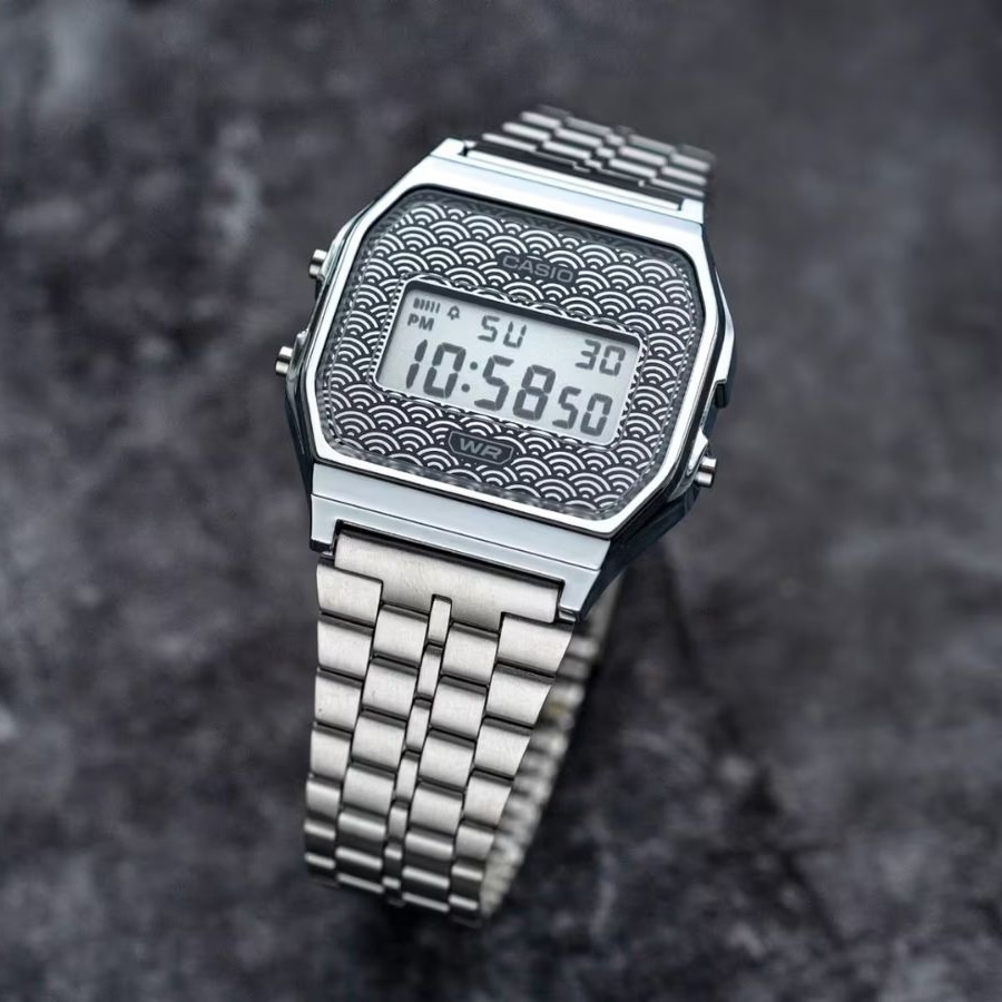 O Casio A159WEVJ-2 tem um mostrador azul com padrão seigaiha sea-and-wave, e o A159WEVJ-7 apresenta o mesmo design em prata. Ambos os modelos têm caixa e moldura de resina cromada na cor prata, com pulseira de aço inoxidável combinando. Além disso, cada um apresenta uma tela de fundo claro com números escuros.
