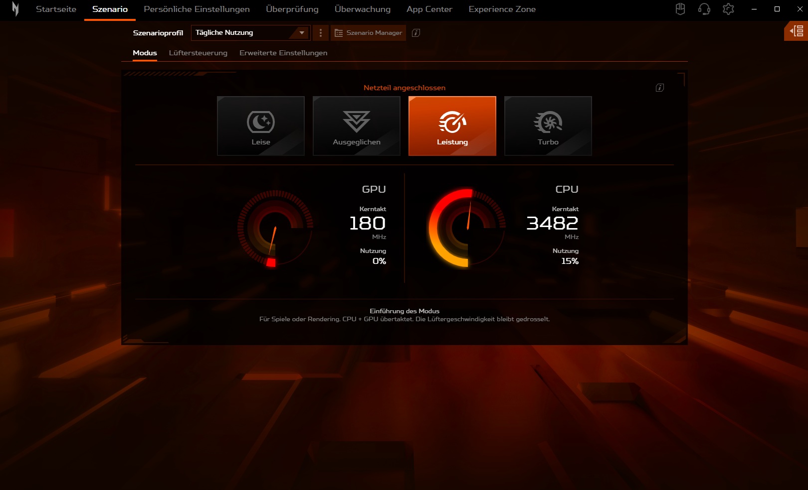 | Modo | Silencioso | Balanceado | Desempenho | Turbo |