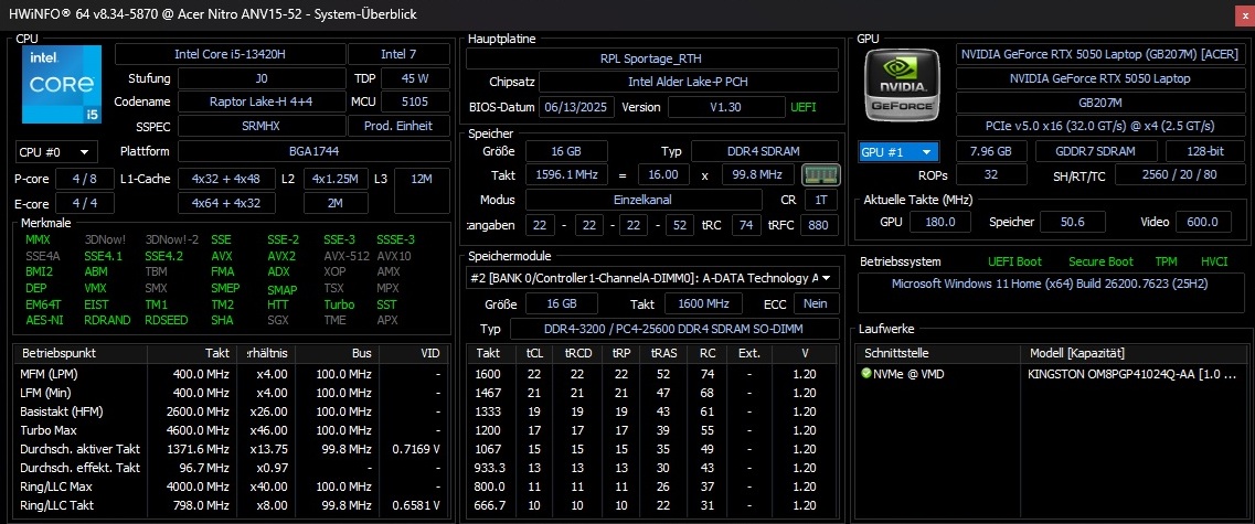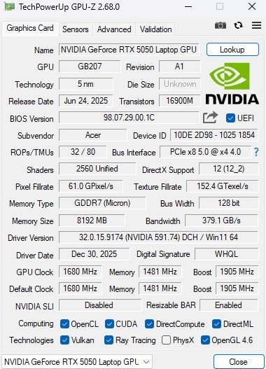 | Acer Nitro V 15 ANV15-52-50S2 Intel Core i5-13420H ⎘ NVIDIA GeForce RTX 5050 Laptop ⎘ 16 GB Memória, 1024 GB SSD | Preço de tabela: 1049 EUR | 2.1 kg | 23.5 mm | 15.60" 1920x1080 141 PPI IPS | |