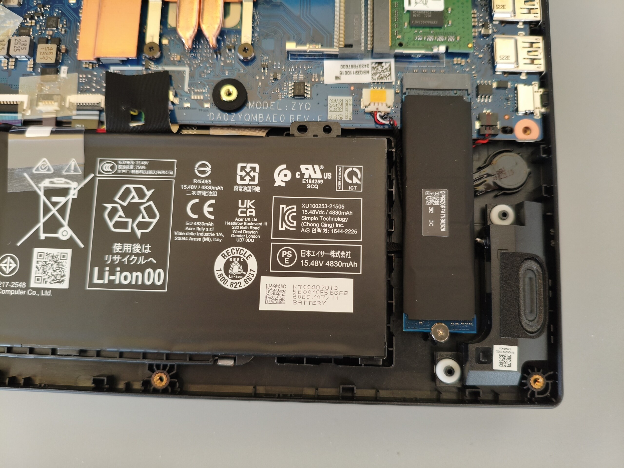A Acer utiliza um chassi totalmente de plástico que é, em sua maioria, bem acabado, embora algumas áreas apresentem uma flexão perceptível. As dobradiças parecem um pouco frouxas e permitem que a tela se abra em um ângulo máximo de aproximadamente 145°. Pesando 2,1 kg, o laptop se iguala ao seu antecessor em termos de peso, enquanto o design geral permanece semelhante, mas não totalmente inalterado.