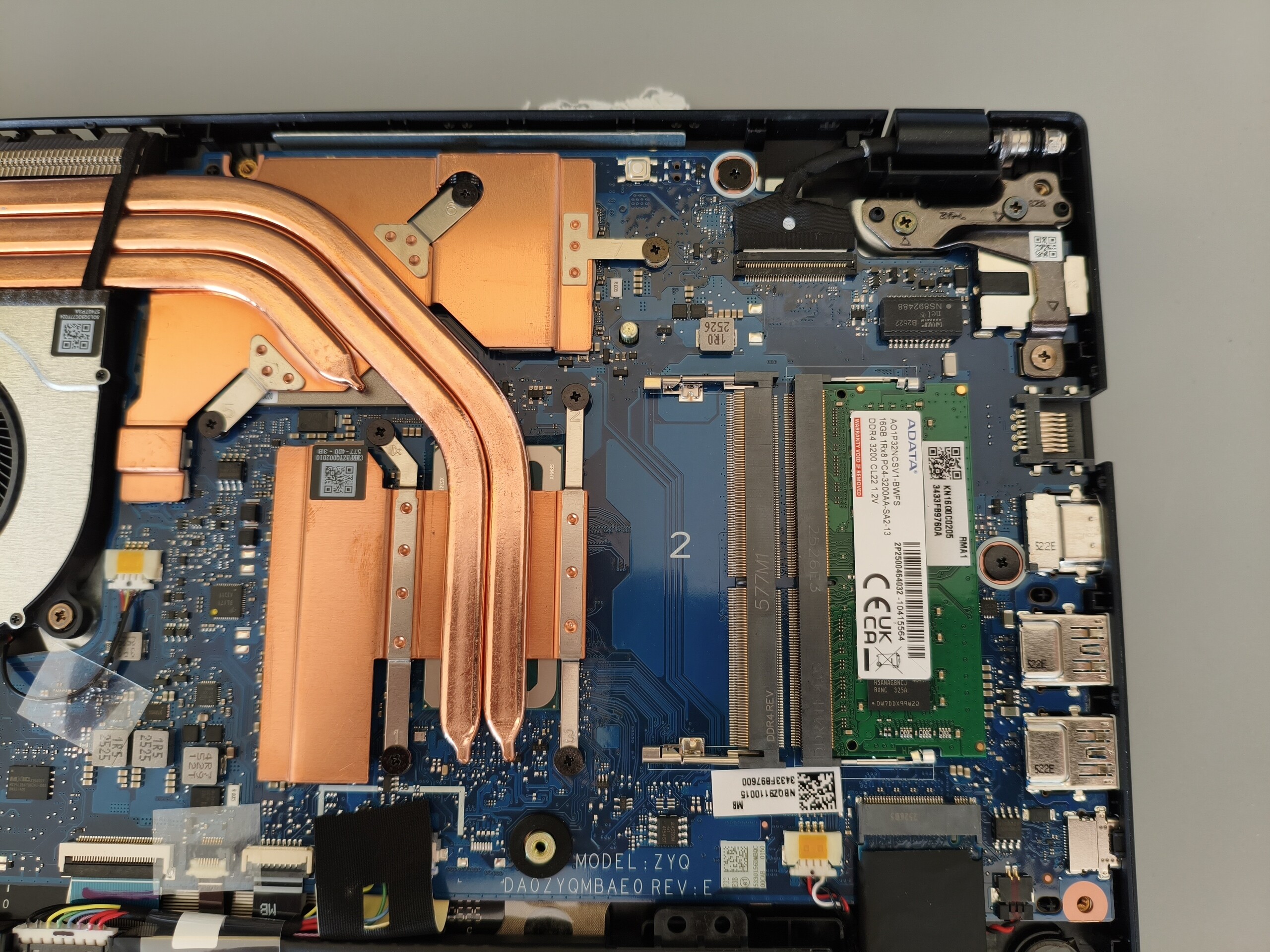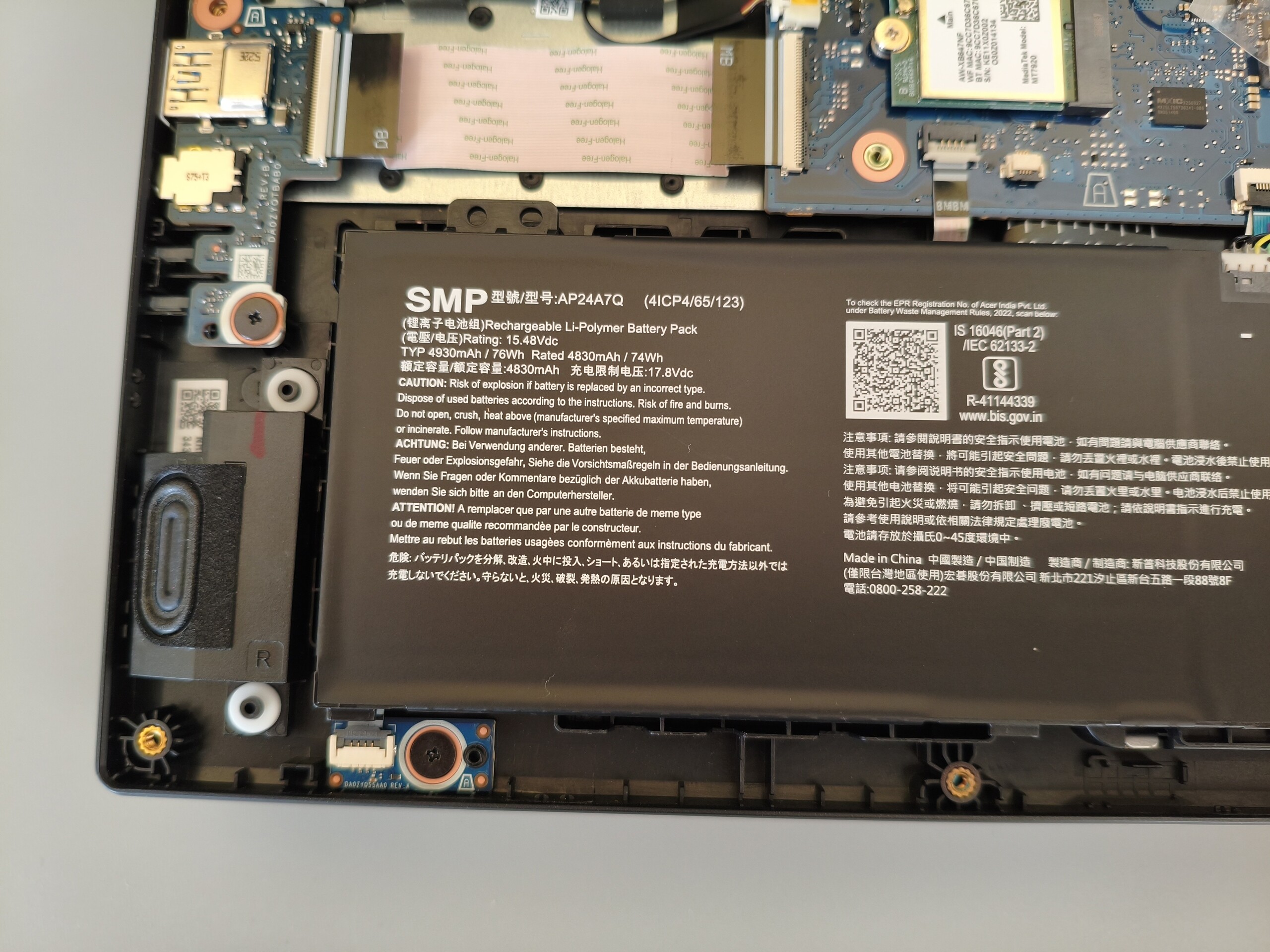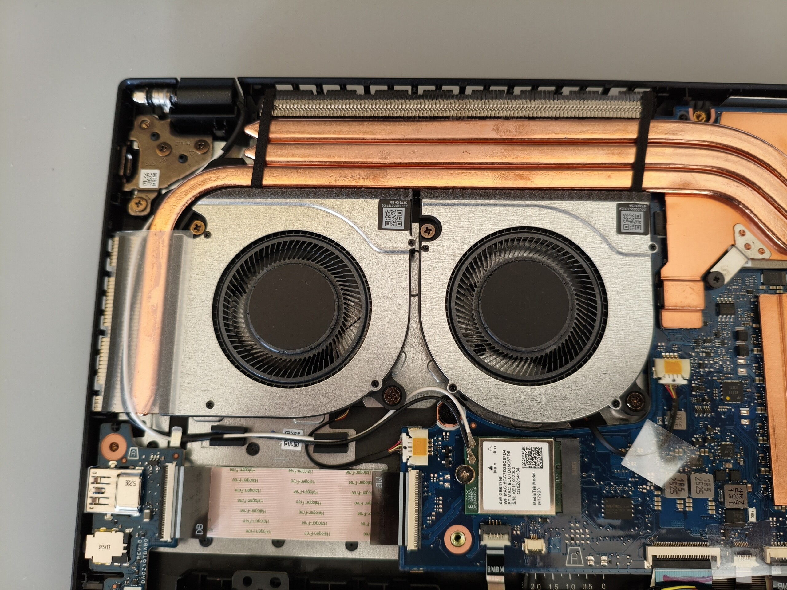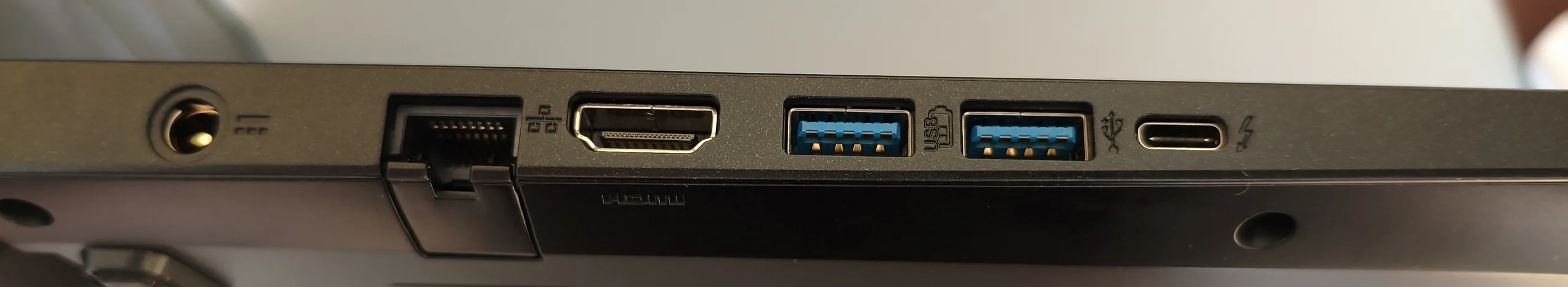 Além da ausência de um leitor de cartão, a seleção de portas deixa pouco espaço para críticas. A porta Gigabit LAN, a saída HDMI e o conector de áudio de 3,5 mm são complementados por três portas USB-A e um conector Thunderbolt 4. Um slot de trava Kensington também está incluído. O módulo Wi-Fi 6E oferece um desempenho mediano e a webcam, um tanto fraca, produz resultados igualmente inexpressivos. Para acessar os componentes internos, é necessário remover 11 parafusos Phillips. As imagens do interior podem ser encontradas mais abaixo.