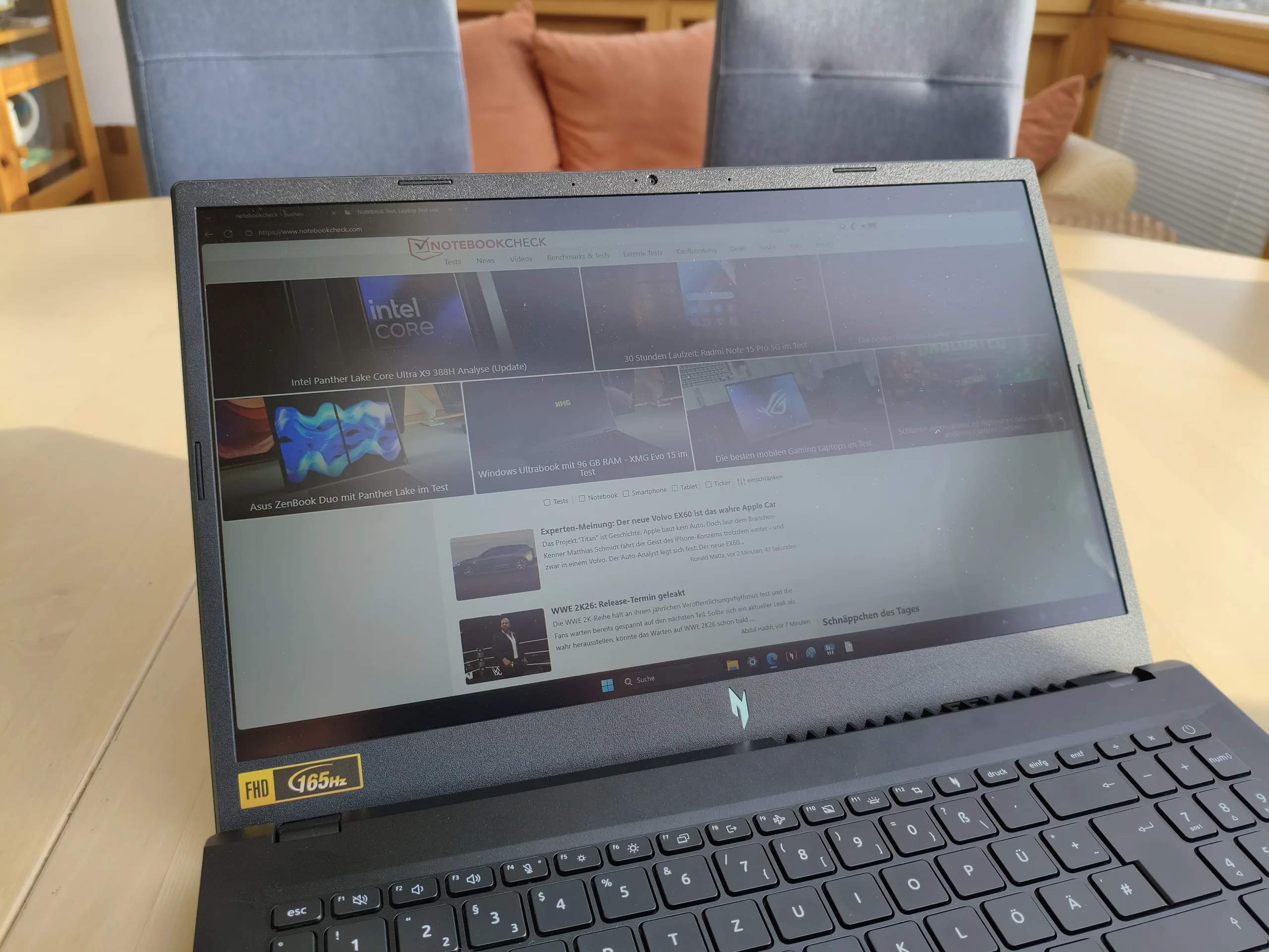 Infelizmente, a cobertura limitada de cores continua sendo um problema para laptops para jogos mais acessíveis, mesmo em 2026. Da mesma forma que o Cyborg 15 e o Victus 15, o Nitro V 15 fica abaixo da marca de 70% sRGB, resultando em uma imagem bastante pálida. O veredito sobre o brilho é mais positivo. Embora a média de 347 cd/m² não seja um destaque, a maioria dos concorrentes fica abaixo desse valor. Os valores restantes são típicos de um painel IPS, seja um nível de preto de 0,31 cd/m² ou uma relação de contraste de 1.232:1. O mesmo se aplica em grande parte aos ângulos de visualização.