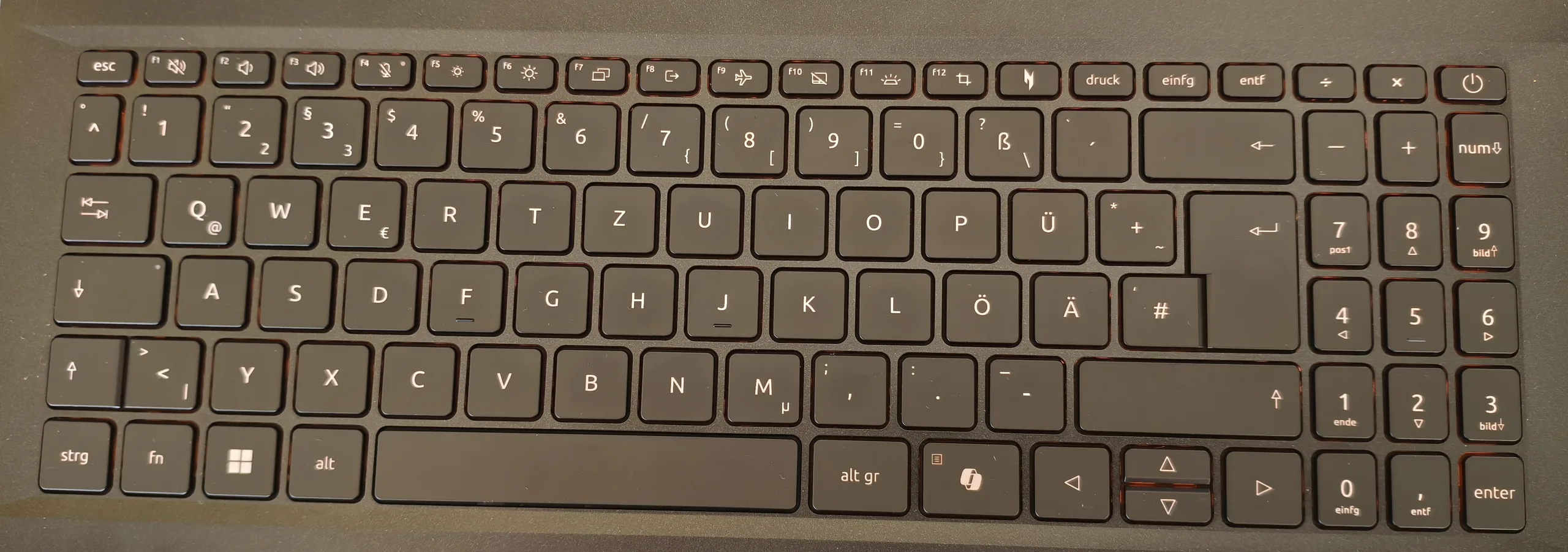 Não ficamos totalmente satisfeitos com o layout do teclado. Os pontos de crítica incluem o teclado numérico de três colunas em vez de um layout completo de quatro colunas, bem como as teclas de seta centrais bastante pequenas. A experiência de digitação é típica de um teclado com cúpula de borracha e, portanto, nada particularmente notável. Também é possível melhorar a iluminação de fundo. A iluminação laranja não é especialmente brilhante, mesmo em sua configuração mais alta. Como ponto positivo, o laptop de 15 polegadas apresenta um touchpad razoavelmente grande, medindo 12,6 x 7,8 cm, embora pareça um pouco irregular quando clicado.