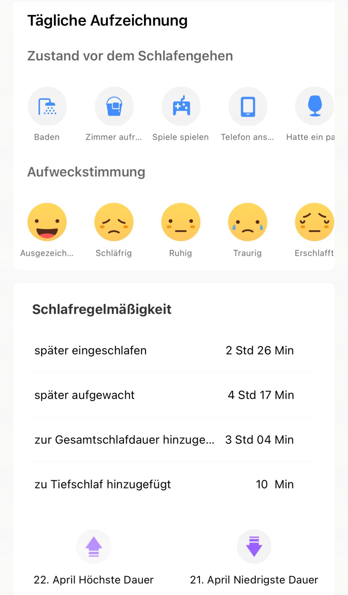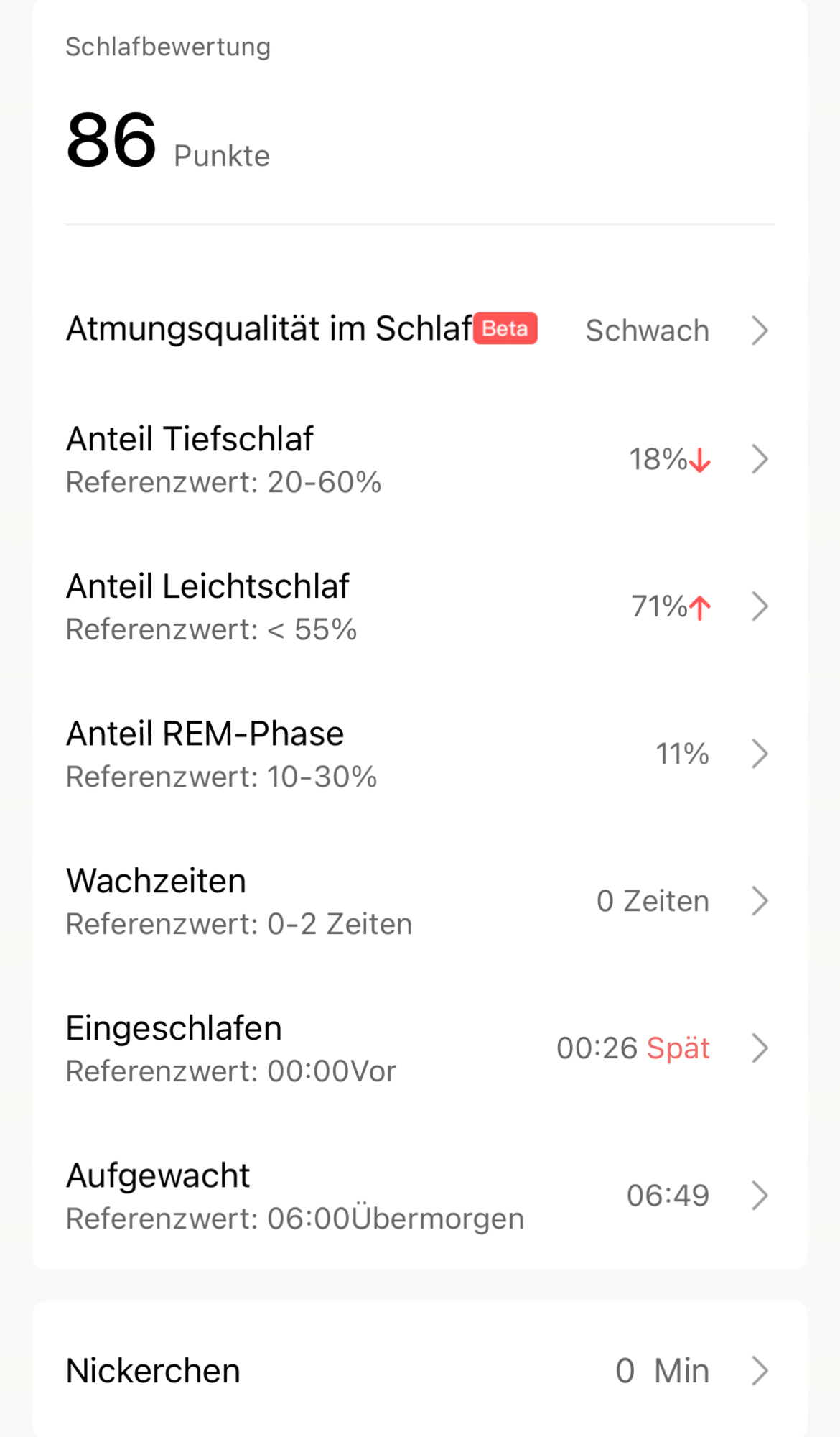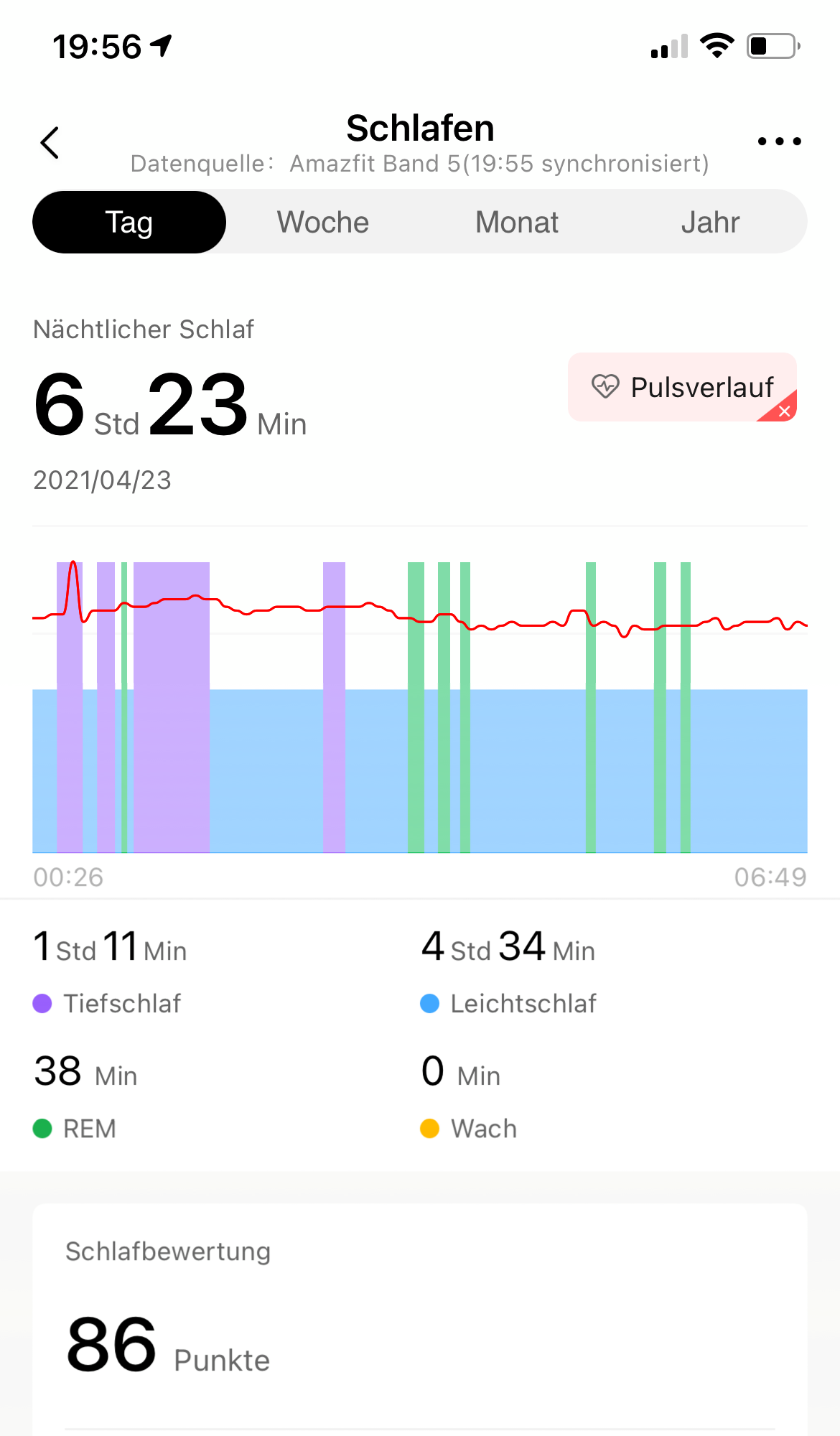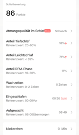 O rastreador Huami também registra o ritmo cardíaco à noite e o sobrepõe com as fases de sono registradas no diagrama do registro do sono. No entanto, o teste revelou inconsistências que lançam dúvidas sobre a confiabilidade: O registro aqui incluído, por exemplo, não reflete uma curta fase de vigília que ocorreu durante a noite em questão