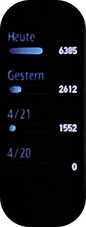 O aplicativo sincroniza os dados coletados através do servidor do fabricante e apresenta as análises em um painel de controle diário. Nas páginas de detalhes, você pode voltar atrás e olhar períodos de tempo mais longos, como aqui para o número de etapas.