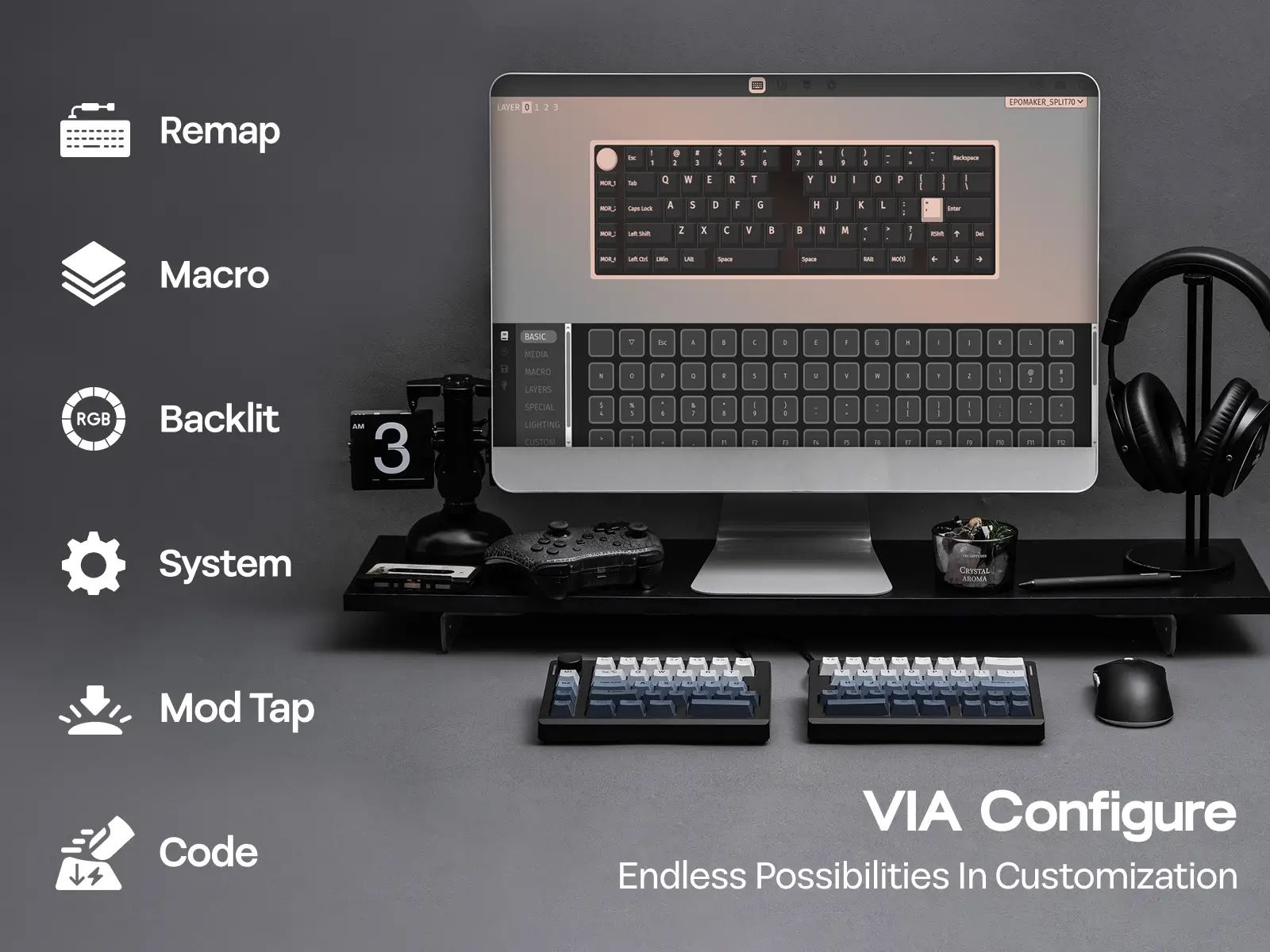As duas metades do teclado podem ser posicionadas livremente, o que pode permitir um uso mais ergonômico. Em princípio, é possível usar apenas uma parte do teclado; o lado esquerdo, por exemplo, deve ser suficiente para uso em jogos de tiro. Faltam um teclado numérico e um teclado de seis teclas, mas um codificador rotativo está incluído.