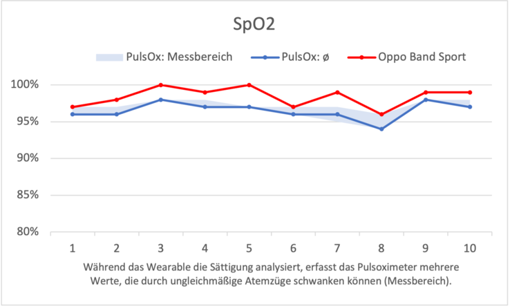 Comparamos a saturação de oxigênio no sangue com o resultado da medição de um oxímetro de pulso em várias corridas. O Oppo Band Sport mede uma saturação maior do que o dispositivo medicamente certificado em todas as 10 medições. Na faixa limite em torno de 90%, um falso valor mais alto poderia perder o efeito de alerta que normalmente vem de um resultado abaixo de 90%