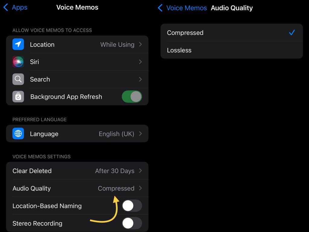 Se o senhor entrar em Ajustes do iPhone > Memorandos de voz > Áudio, encontrará duas opções de qualidade: compactada e sem perdas.