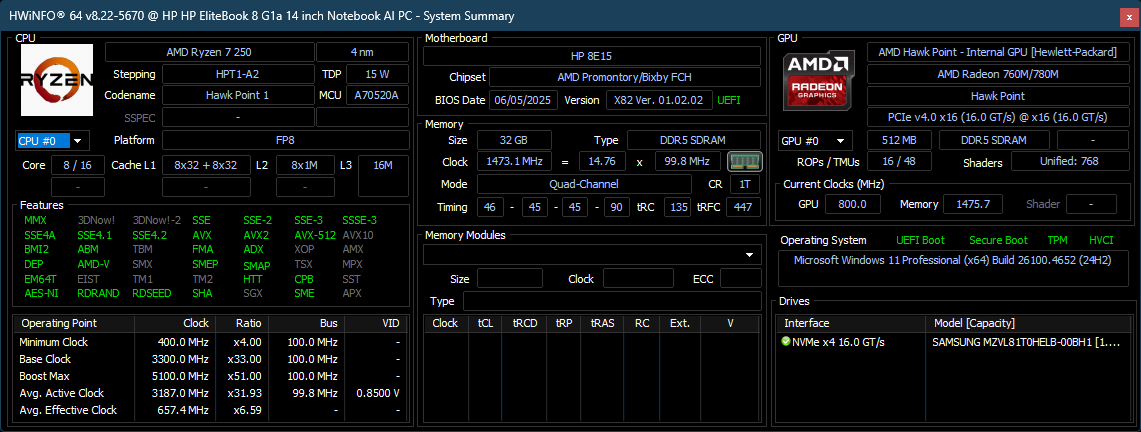 HP EliteBook 8 G1a 14 AD3E9ET Radeon 780M, R7 250, Samsung PM9C1 MZVL81T0HELB-00BTW | HP EliteBook 845 G11 Radeon 780M, R7 PRO 8840HS, Kioxia XG8 KXG80ZNV1T02 | Dell Pro 14 Premium Arc 140V, Core Ultra 7 268V, Kioxia BG6 KBG6AZNV1T02 | Lenovo ThinkPad T14s Gen 6 21M2S00G00 Radeon 880M, Ryzen AI 7 PRO 360, Kioxia XG8 KXG8AZNV1T02 | HP EliteBook X G1a 14 AI Radeon 890M, Ryzen AI 9 HX PRO 375, Kioxia XG8 KXG80ZNV1T02 | |