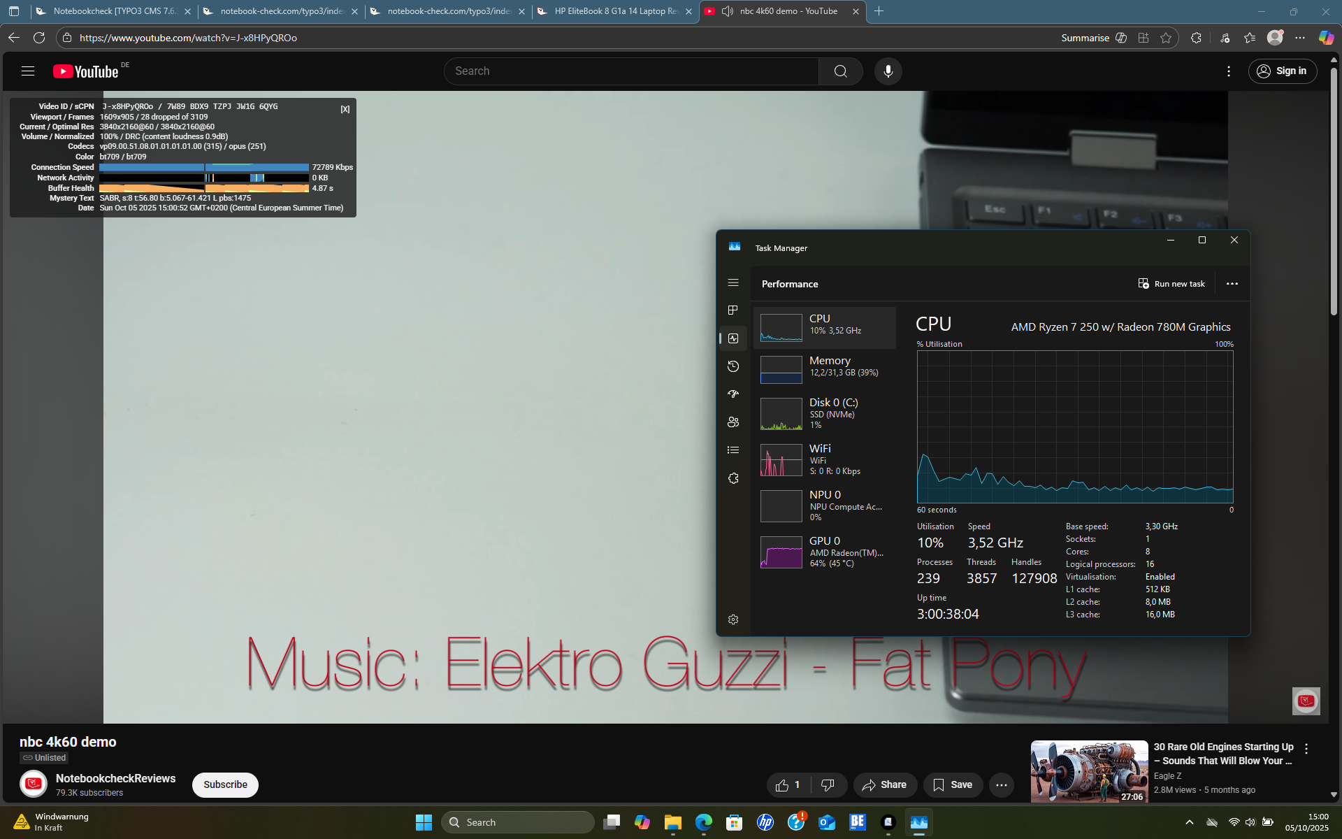O EliteBook 8 G1a 14 é um laptop bastante eficiente em termos de consumo de energia, com cerca de 3 W em marcha lenta, que dobra para 6 W quando a tela está ligada e os dispositivos de rádio estão ativados. Ele é apenas um pouco menos eficiente do que o notebook baseado no Zen5 Lenovo ThinkPad T14s Gen 6 AMD.