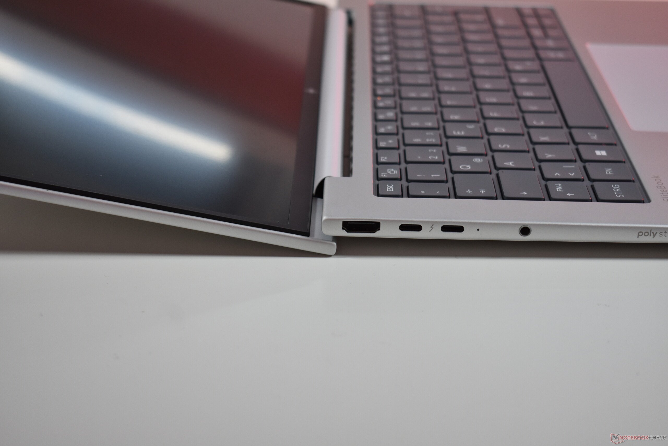 A HP modernizou cuidadosamente a seleção de portas de sua linha EliteBook, substituindo uma das portas USB-A por outra USB-C. Vantagens: Agora é possível carregar o dispositivo de ambos os lados. No entanto, o novo USB-C do lado direito não oferece os mesmos recursos que o do lado esquerdo, pois não possui a função Thunderbolt 4.