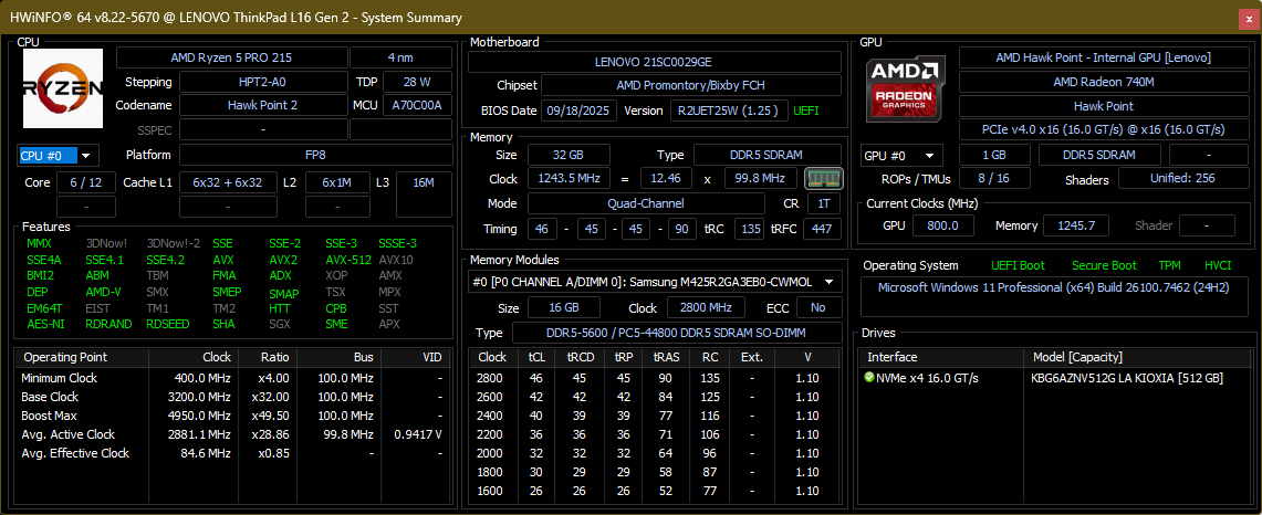 Em vez de CPUs Zen3+ mais antigas, como seu antecessor, o Lenovo ThinkPad L16 Gen 2 oferece uma escolha entre várias CPUs Zen4 e Zen5, chegando ao AMD Ryzen AI 7 Pro 350as dGPUs não estão disponíveis, já que a Lenovo conta apenas com as iGPUs das CPUs. A RAM pode ser configurada para até 64 GB graças a dois slots DDR5-5600 SO-DIMM. E um único SSD M.2 2280 NVMe PCIe 4.0 lida com o armazenamento.