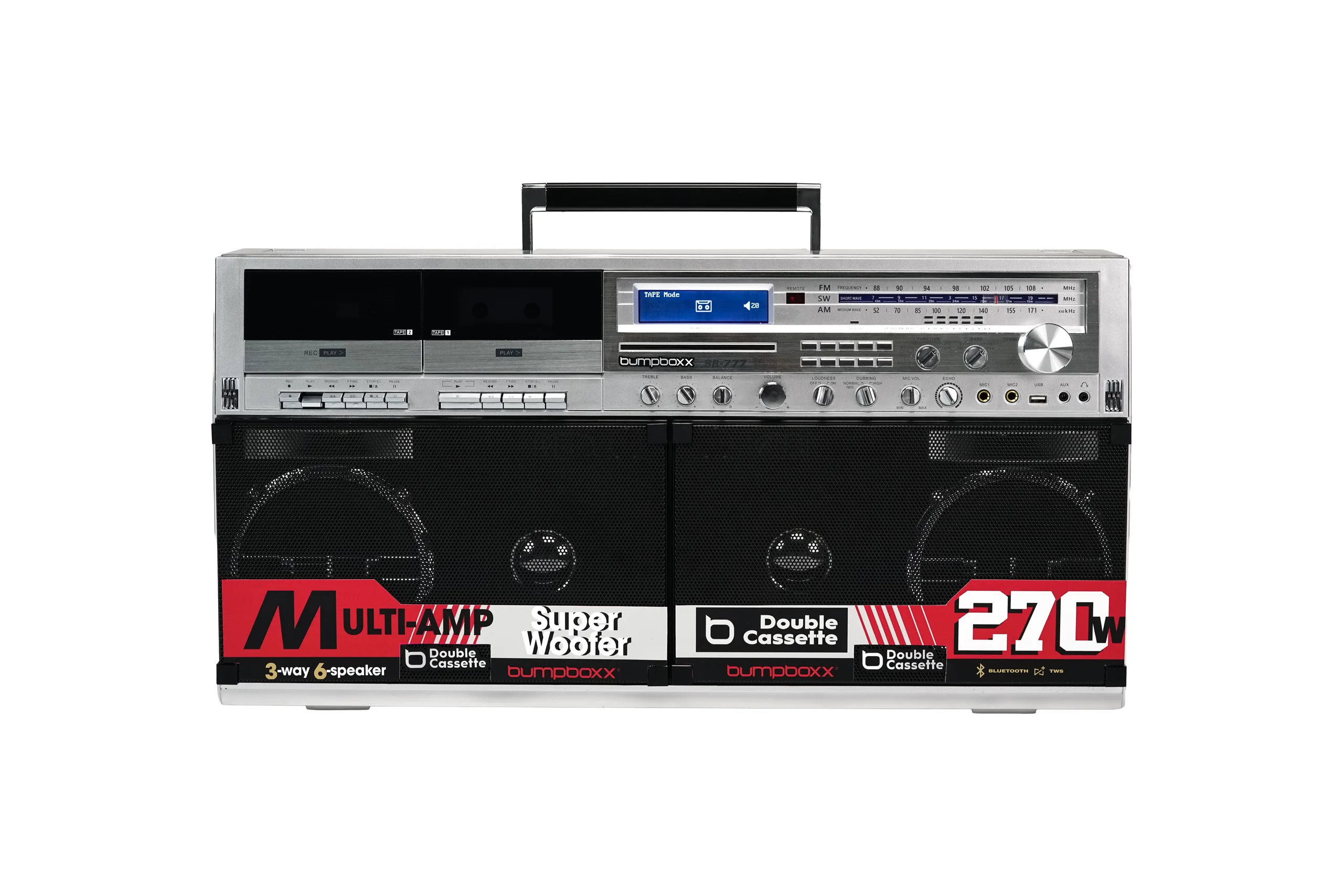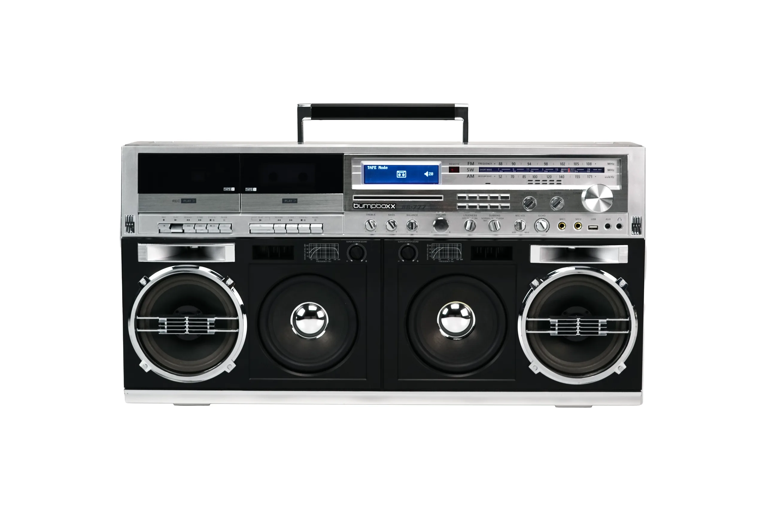 LOS ANGELES, CA - A Bumpboxx orgulhosamente anuncia o lançamento do BB-777, um boombox portátil de alta potência que une formatos analógicos clássicos com desempenho digital moderno em um sistema de som totalmente integrado. Fornecendo até 270 watts de potência por meio de uma arquitetura de vários alto-falantes com super woofers duplos, tweeters de precisão e uma caixa de graves com câmara, o BB-777 produz um som profundo e envolvente com presença física inconfundível.