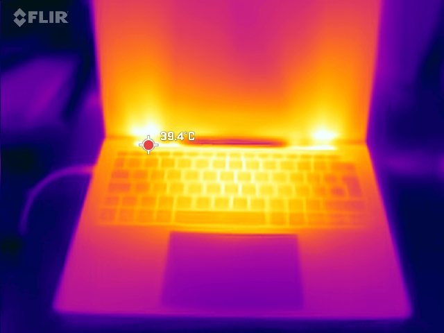 No teste de estresse, o ponto quente atinge 43 °C na parte inferior, próximo ao centro, em direção à tela. A área central do teclado também esquenta, mas os dois lados permanecem mais frios e os apoios para as mãos permanecem confortavelmente frios.