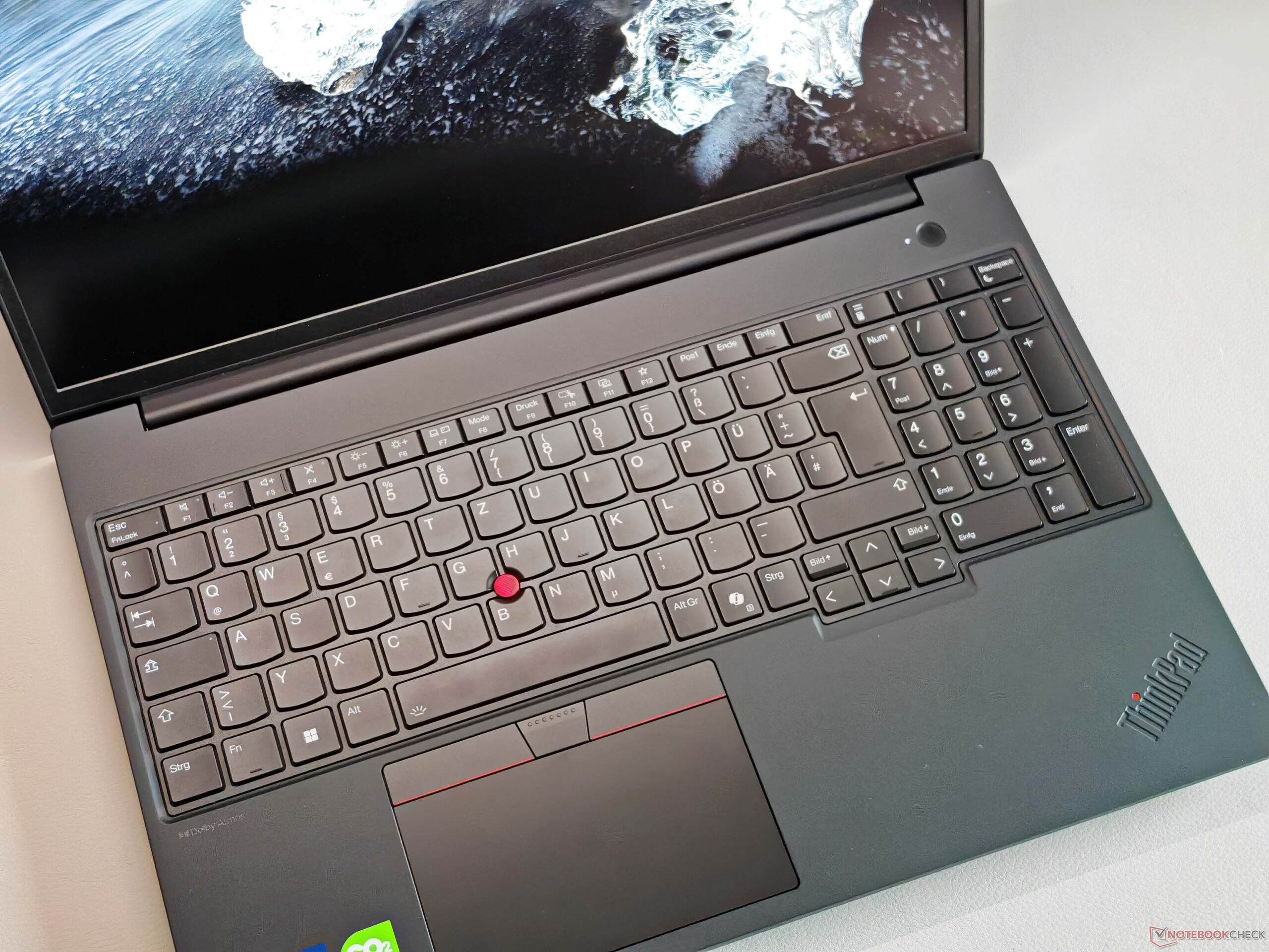 O teclado retroiluminado, incluindo o teclado numérico, também atende ao padrão atual do ThinkPad, embora existam modelos significativamente melhores na linha atual (por exemplo ThinkPad P1 16 G8). No geral, descreveríamos a sensação de digitação como confortável e precisa, mas a concorrência pode fazer isso pelo menos tão bem. O ClickPad (11,5 x 6,7 cm/~4,5 x ~2,6 polegadas) é bem pequeno para os padrões modernos devido aos botões TrackPoint dedicados, mas a operação é excelente e os cliques mecânicos na área inferior também são de altíssima qualidade. Isso também se aplica aos botões do TrackPoint.