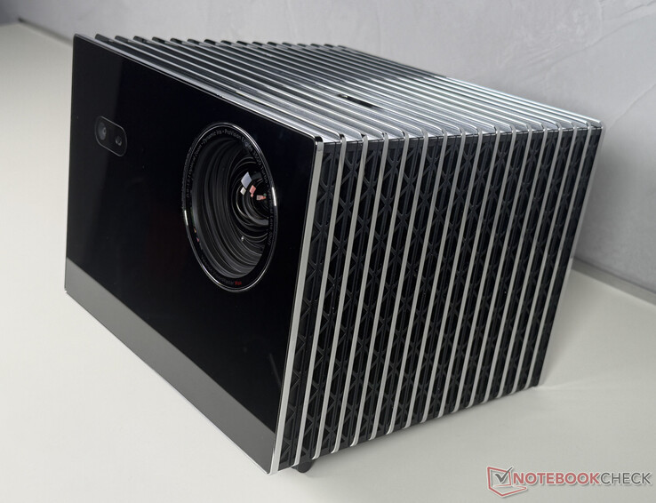Mesmo à primeira vista, o Valerion VisionMaster Max é uma verdadeira afirmação. Medindo cerca de 25 x 25 x 20 cm e pesando 7,5 kg, o dispositivo é fornecido em uma caixa de couro sintético e tem um design elegante com uma carcaça preta de alto brilho e lâminas de metal. Isso transforma o projetor em um objeto de design que não precisa ser escondido nem mesmo em interiores elegantes.