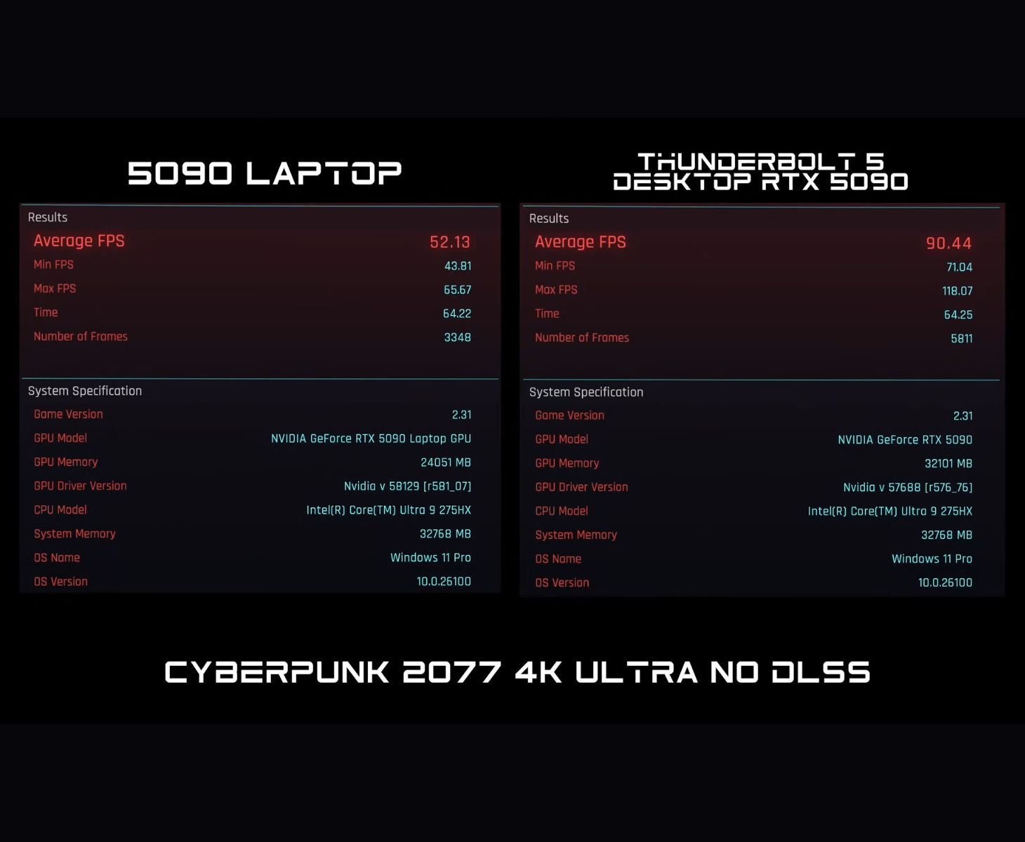 Portanto, ao testar o Cyberpunk 2077, podemos ver a maior diferença entre as duas configurações. Em 4K Ultra sem DLSS, a GPU RTX 5090 para laptop obteve 52 FPS. Enquanto isso, a RTX 5090 via dock eGPU marcou 90 FPS. A diferença de TGP também foi significativa, pois o laptop RTX 5090 consumiu cerca de 170 W, enquanto o dock Razer eGPU consumiu cerca de 460 W de energia.