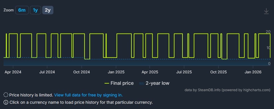 Por fim, apesar do desconto de 75%, seu preço caiu várias vezes no ano passado, de acordo com o site SteamDB. E deve-se observar que seu preço mais baixo foi de US$ 3,99 em junho de 2023, representando um desconto de 80%.