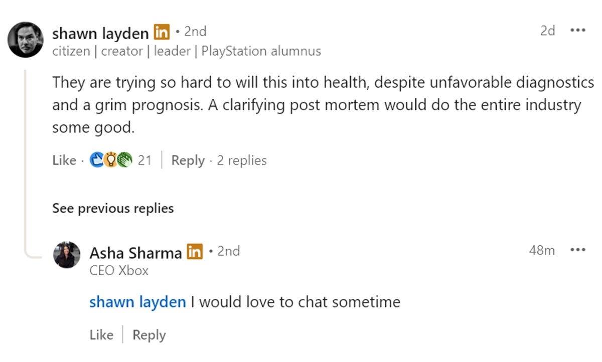 Layden respondeu a um artigo do The Verge sobre comentários vazados feitos pela CEO do CEO do Xbox, Asha Sharma. Ela admitiu que níveis como o Ultimate eram "muito caros para os jogadores". Os fãs viram o último Aumento de preço do Xbox Game Pass em outubro de 2025, provocando uma onda de cancelamentos. O executivo também explicou que a Microsoft precisa oferecer uma "equação de valor melhor"