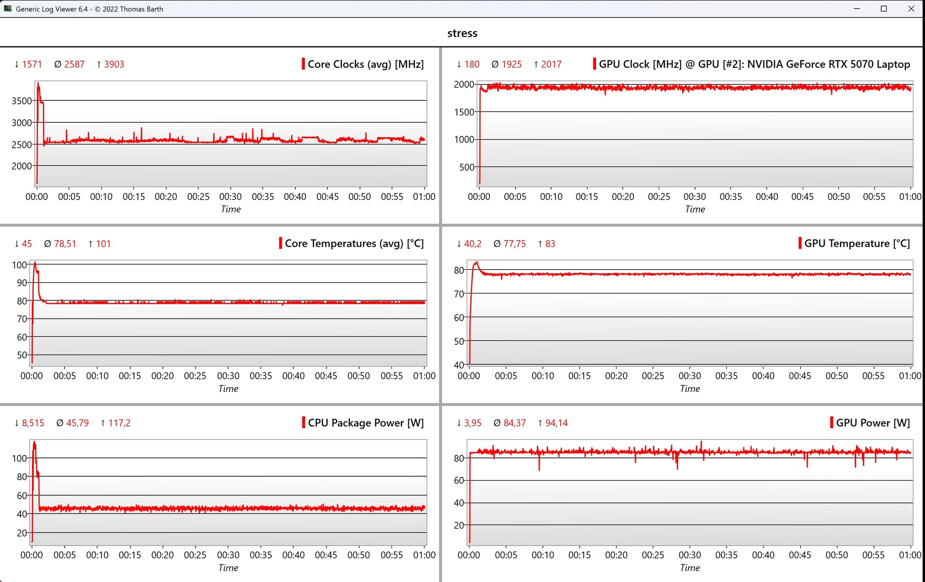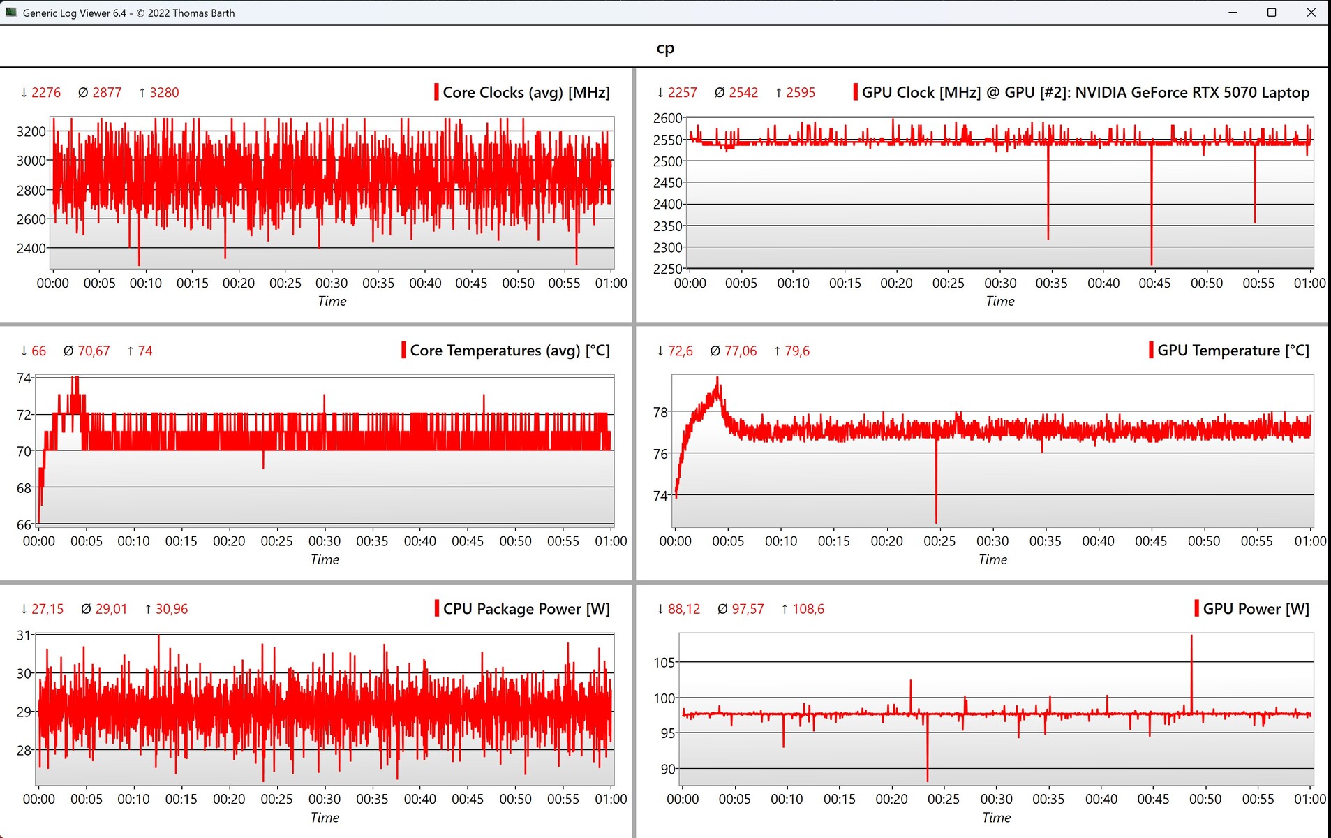 Também não há diferenças significativas nas temperaturas da superfície em comparação com a versão testada anteriormente e não há pontos críticos de aquecimento. No teste de estresse, o processador opera a 45 watts (~78 °C/172,4 °F) e a placa de vídeo a 85 watts (~78 °C/172,4 °F).