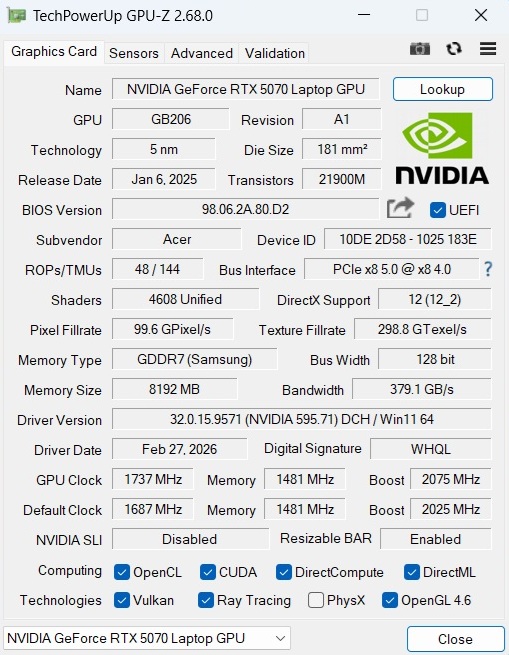 | Acer Nitro 18 AI AN18-61-R10V Ryzen AI 7 350, GeForce RTX 5070 Laptop | Asus TUF Gaming A18 FA808UP-S8022W R7 260, GeForce RTX 5070 Laptop | MSI Crosshair 18 HX AI A2XW Ultra 9 275HX, GeForce RTX 5070 Laptop | Asus ROG Strix G18 2025 G814 R9 9955HX, GeForce RTX 5070 Laptop | MSI Vector A18 HX A9W R9 9955HX, GeForce RTX 5070 Ti Laptop | Média NVIDIA GeForce RTX 5070 Laptop | |
