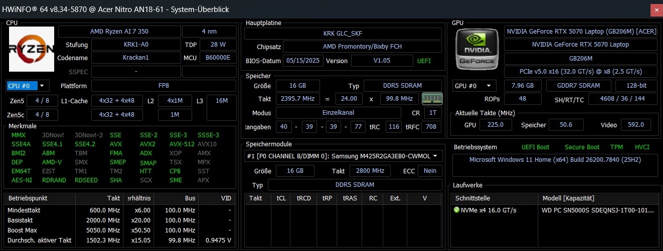 | Acer Nitro 18 AI AN18-61-R10V AMD Ryzen AI 7 350 ⎘ NVIDIA GeForce RTX 5070 Laptop ⎘ 16 GB Memória, 1000 GB SSD | Amazon: Preço de tabela: 1900 EUR | 3 kg | 25 mm | 18.00" 2560x1600 168 PPI IPS | |
