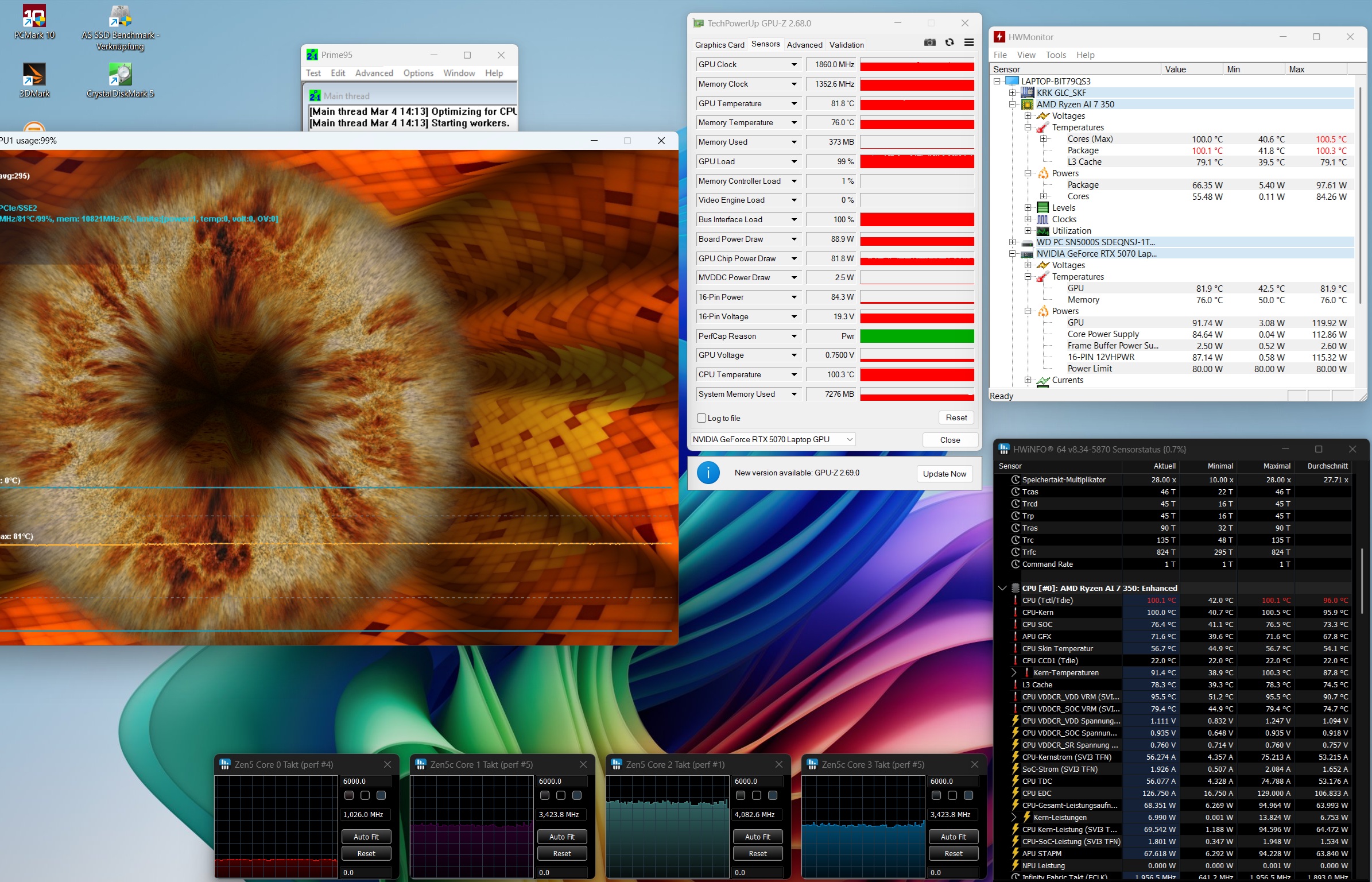 Sob carga, a parte superior, em particular, aquece. Um máximo de 44 °C (111,2 °F) contrasta com um máximo de 57 °C (134,6 °F) na parte inferior da carcaça. Com esses valores, o modelo de 18 polegadas está à frente da concorrência. Enquanto isso, quase não há diferenças entre os concorrentes no modo inativo.