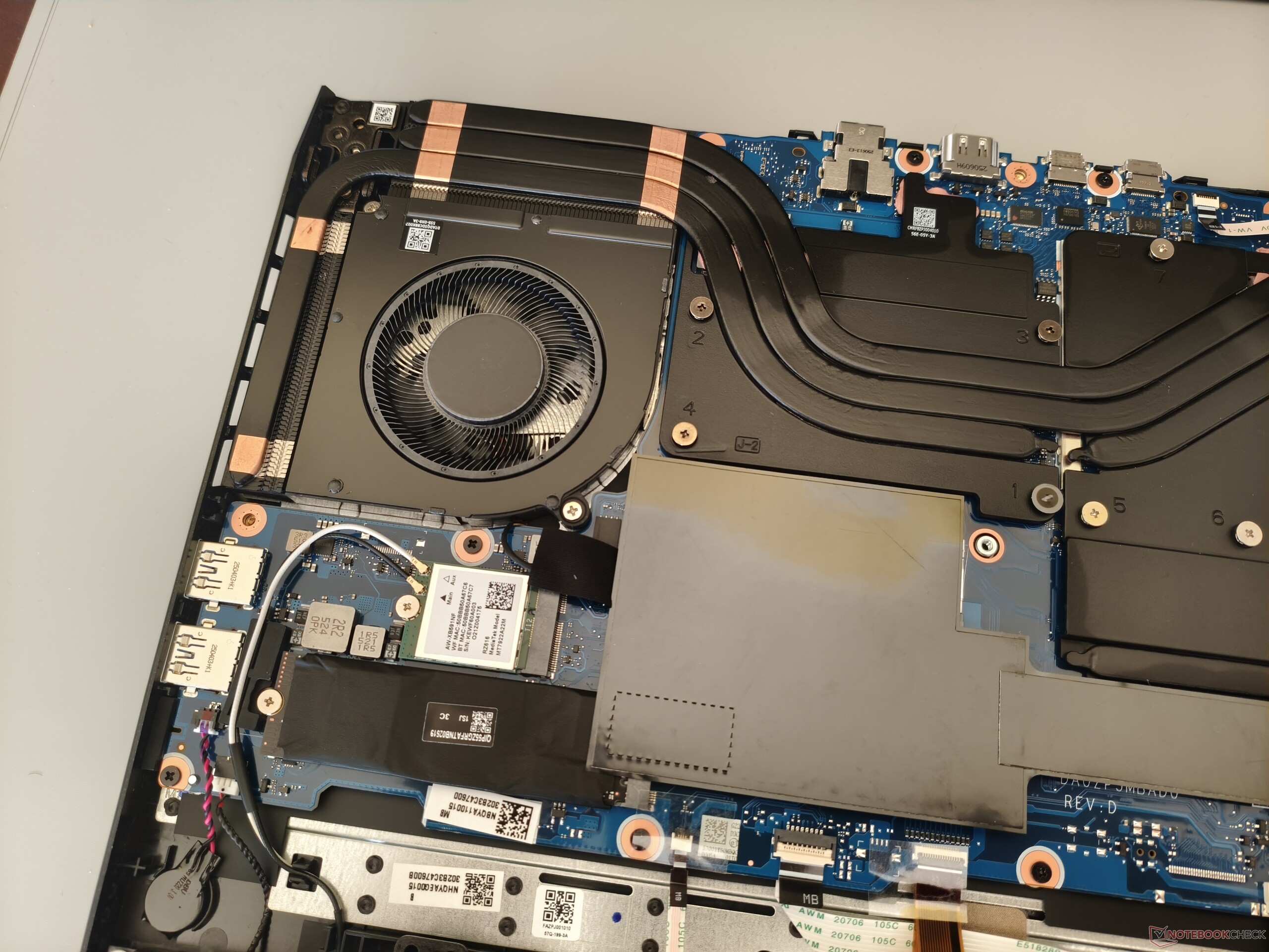O módulo sem fio da MediaTek (Wi-Fi 6E) tem um desempenho particularmente bom em termos de recepção. Graças à sua resolução Full HD, a webcam é um pouco mais nítida do que em muitos outros laptops para jogos, mas ainda não é realmente impressionante. Para acessar o funcionamento interno, é necessário remover 10 parafusos Phillips. Nossas fotos revelam como é a parte interna.