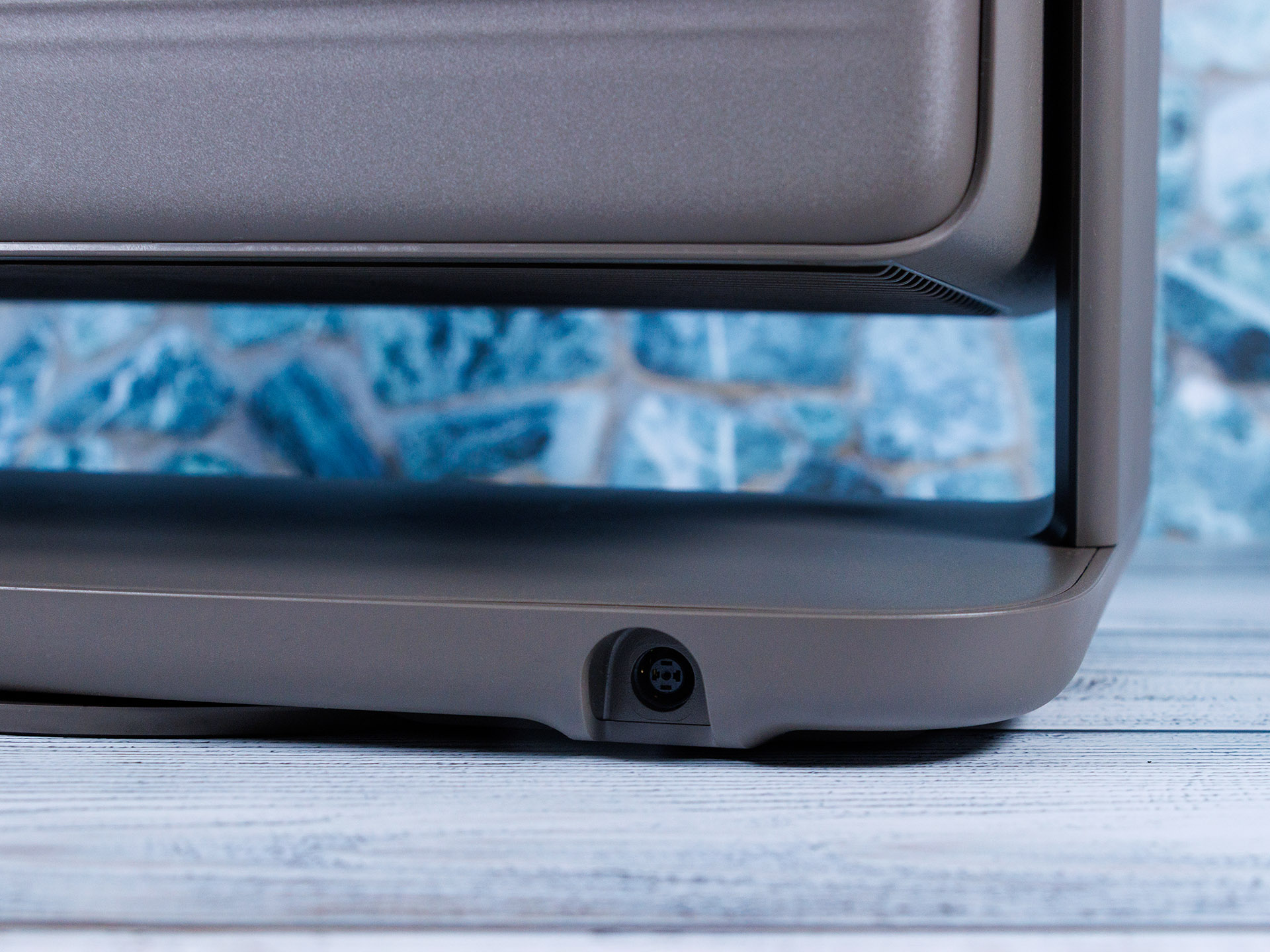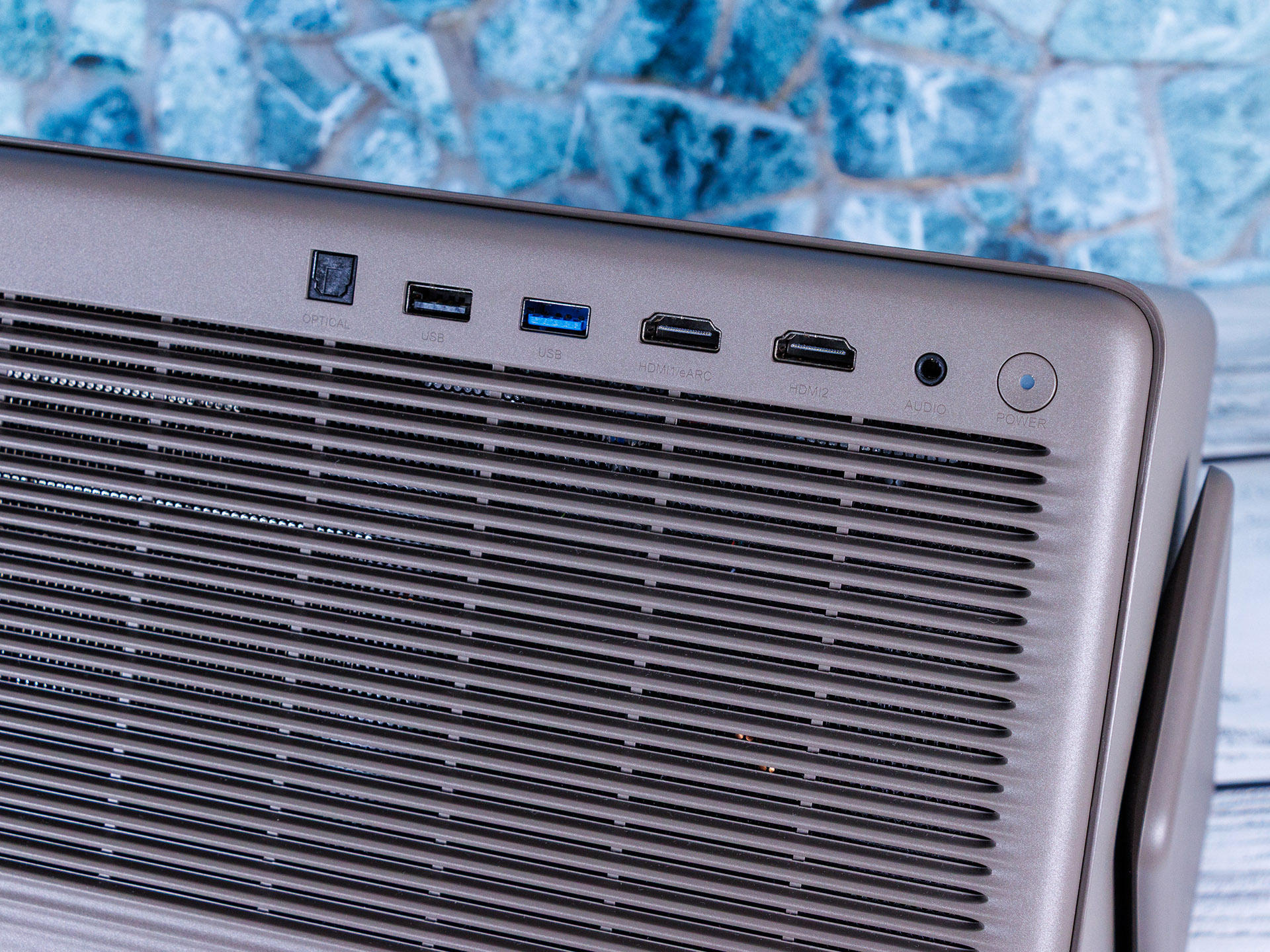 O Xgimi Horizon 20 Max tem um suporte fixo com uma rosca de ¼" na parte inferior para aparafusar o projetor no suporte de chão opcional. A placa de base tem uma mesa giratória integrada, permitindo que o projetor seja girado 360° e inclinado em um total de 135°. Com sua aparência de couro falso, ela combina bem com a maioria das salas de estar e também não é particularmente suscetível à sujeira.