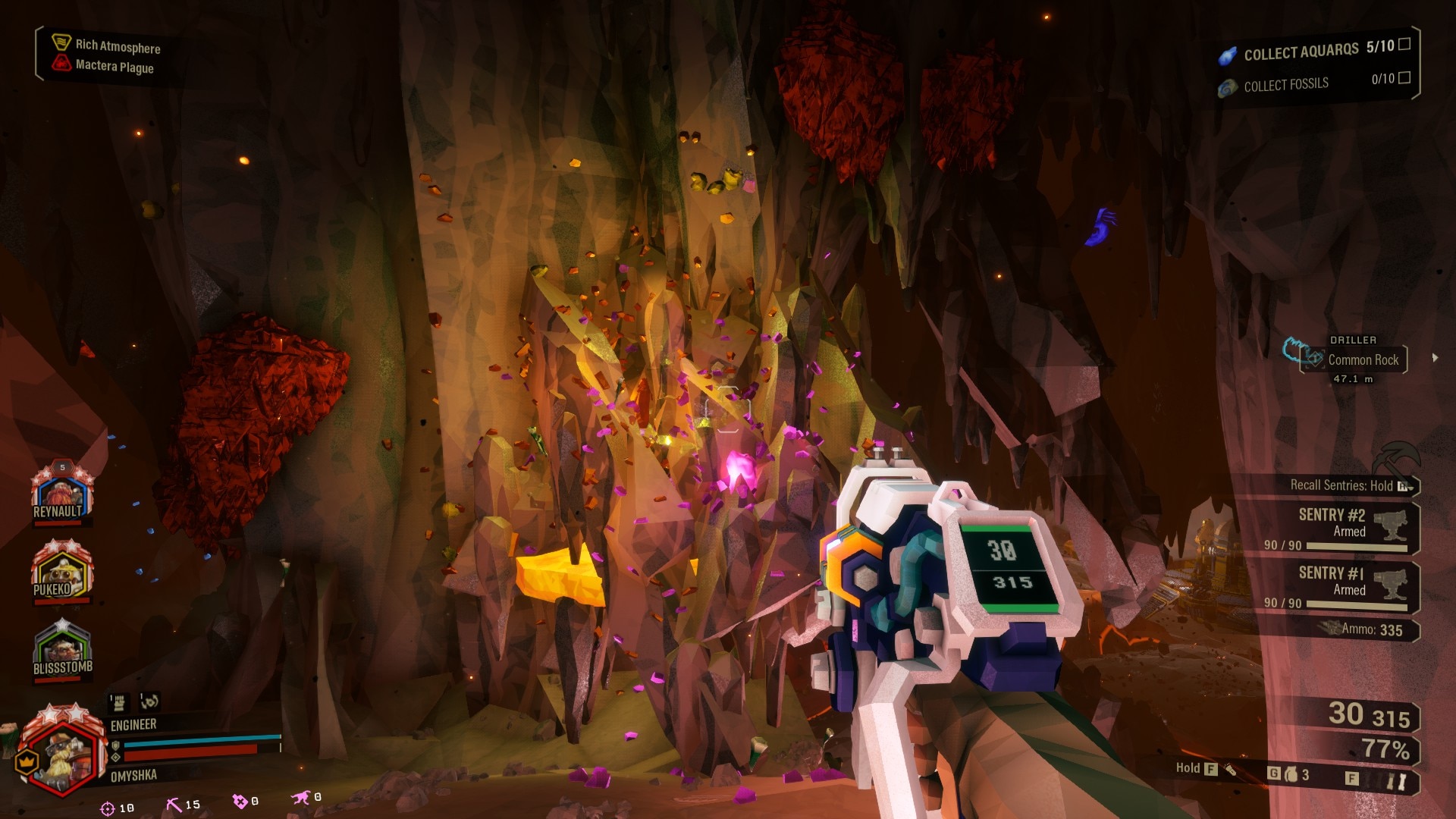 O título apresenta quatro classes distintas - Scout, Gunner, Engineer e Driller - cada uma com uma função claramente definida e ferramentas exclusivas que se complementam. O ambiente totalmente destrutível permite que os jogadores cavem túneis, criem atalhos ou controlem taticamente espaços apertados durante o combate. As missões giram em torno da coleta de recursos, da conclusão de objetivos e da defesa contra ondas de criaturas alienígenas. À medida que os jogadores progridem, eles desbloqueiam novas armas, melhorias e recompensas cosméticas para personalizar ainda mais seus equipamentos.