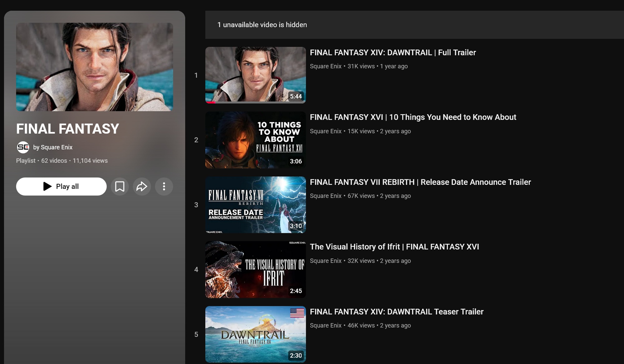 A lista de reprodução do YouTube mostra trailers que promovem as principais adições à popular série de RPG. Um vídeo para a expansão Final Fantasy 14: Dawntrail foi a última nova seleção, publicada em 2024. As editoras geralmente preparam o conteúdo com antecedência, mas mantêm a mídia não listada até a revelação. Dito isso, os jogadores já viram entradas privadas semelhantes da Rockstar que não resultaram em um novo Trailer do GTA 6 .