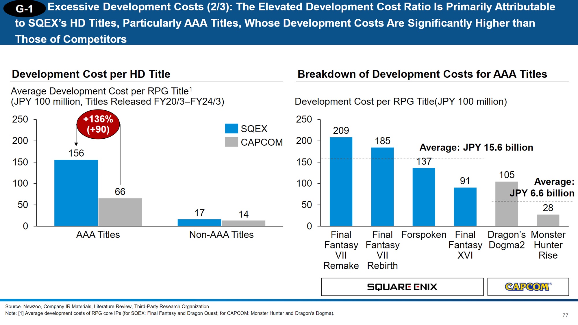 a 3D Investment Partners publicou uma série de slides no site https://www.3dipartners.com/wp-content/uploads/square-enix-presentation-material-en-202512.pdf detalhando os supostos gastos desnecessários da empresa. Juntamente com outros acionistas, a empresa deseja "estabelecer um diálogo construtivo com a SQEX HD para aumentar seu valor corporativo" De acordo com o relatório, muitos jogos da Square Enix eram caros demais para serem produzidos em relação à receita que geravam.