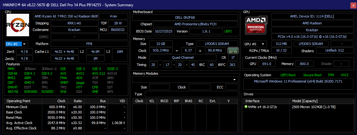 | Dell Pro 14 Plus PB14255 GH77W AMD Ryzen AI 7 PRO 350 ⎘ AMD Radeon 860M ⎘ 32 GB Memória, 1024 GB SSD | Preço de tabela: 1630 Euro | 1.6 kg | 22 mm | 14.00" 1920x1200 162 PPI IPS LED | |
