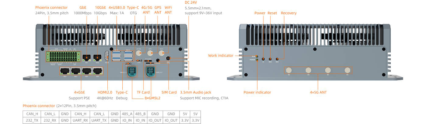 O mini PC, medindo 277,95 x 136,09 x 88,0 milímetros, vem com 64 GB de RAM LPDDR5 e armazenamento eMMC com capacidade de 64 GB. Um SSD M.2 no formato M.2 2280 também pode ser instalado. A saída de vídeo pode ser facilitada por HDMI 2.0 ou por conexões GMSL2 especiais. A conectividade de rede é possível por meio de várias portas Ethernet com 10 Gbps e 5 Gbps. Outras portas incluem USB 3.0, USB 3.2, conectores Phoenix, RS485, RS232, CAN 2.0 e UART.
