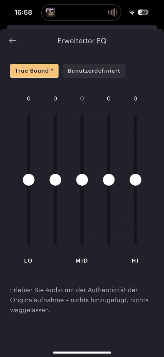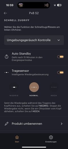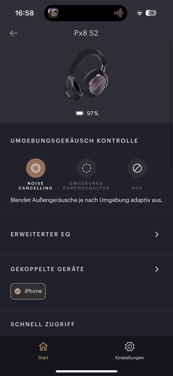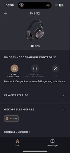 É uma pena que o botão para alternar entre os modos ANC e transparência não forneça um feedback claro - a B&W reproduz diferentes tons para mostrar aos usuários qual modo foi selecionado. Entretanto, esses tons não são autoexplicativos e, portanto, precisam ser memorizados. Por outro lado, o som simplesmente não é audível enquanto a música está sendo reproduzida. Embora os fones de ouvido diminuam brevemente o volume da música quando o botão é pressionado, o som é reproduzido antes e, portanto, não é audível em volumes mais altos