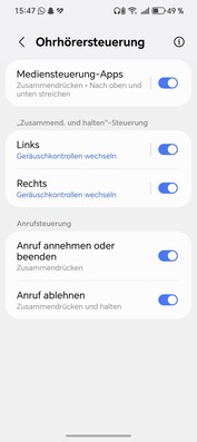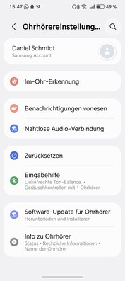 Os controles de toque na haste do Samsung Galaxy Buds3 FE permitem um controle preciso: toque para reproduzir/pausar, deslize para aumentar o volume e mantenha pressionado para alternar o modo ANC. Esses gestos podem ser personalizados no aplicativo Galaxy Wearable. O aplicativo também permite predefinições de EQ, testes de ajuste de ponta, atualizações de firmware e acesso às ferramentas de IA do Galaxy, como o Modo Intérprete. A alternância perfeita entre os dispositivos Galaxy funciona perfeitamente, mas não há multiponto para dispositivos que não sejam da Samsung.