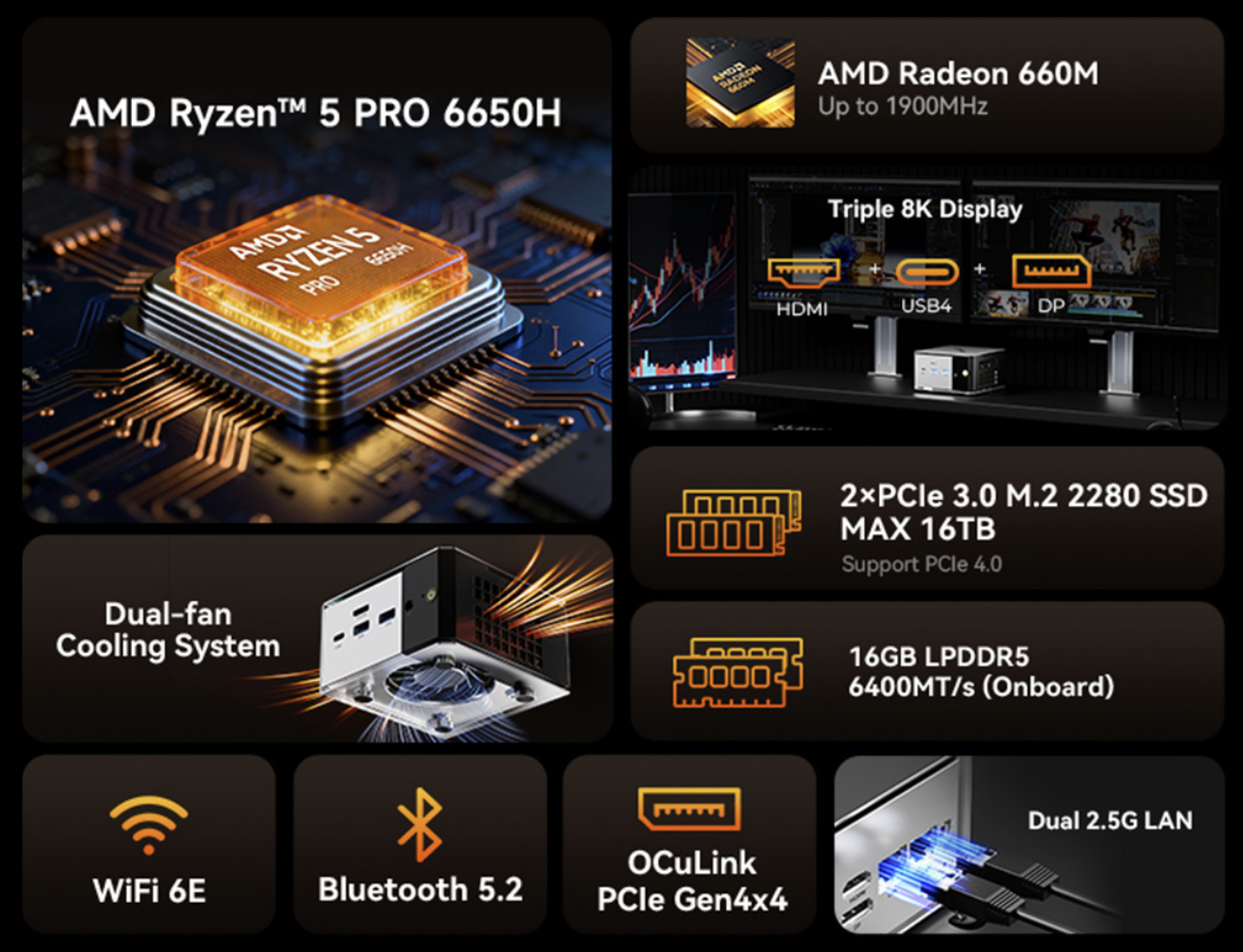Dito isso, a GMKtec equipa o M8 com o Ryzen 5 Pro 6650H em vez do Ryzen AI 9 HX 370 encontrado no EVO-X1. Uma APU de 6 nm com seis núcleos Zen 3+ e uma iGPU Radeon 660M, o Ryzen 5 Pro 6650H fica bem aquém do Ryzen AI 9 HX 370 em benchmarks de CPU e fica ainda mais atrás em jogos. Como resultado, o GMKtec M8 atualmente custa a partir de US$ 329,99 com 16 GB de RAM e 512 GB de armazenamento. Supostamente um desconto de lançamento de US$ 150, essa configuração é apenas US$ 30 mais barata do que uma versão do mesmo dispositivo com 1 TB de armazenamento. Consulte o site GMKtec para obter mais detalhes.