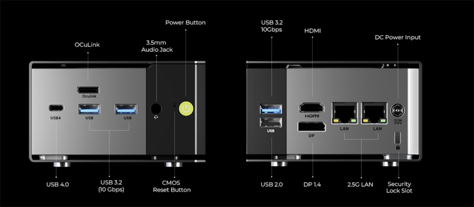 Em relação às semelhanças, o GMKtec M8 tem OCuLink montado na frente, USB4 e duas portas USB 3.2 Tipo A. Como mostram as imagens acima e abaixo, elas são acompanhadas por um conector de 3,5 mm, um botão de reinicialização do CMOS e um botão liga/desliga, sendo que o último fica encostado na borda direita. Além disso, a GMKtec incluiu uma estrutura metálica flutuante em mais uma referência ao já existente EVO-X1.