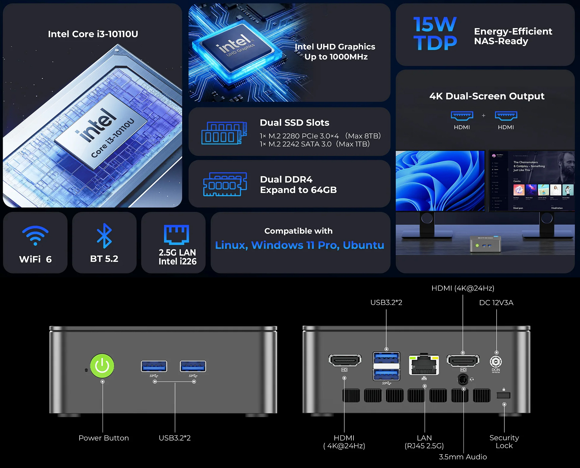 Sob o capô, o GMK NucBox G3 Pro tem o Intel Core i3 10110U. É um processador dual-core da linha Comet Lake e pode ser emparelhado com até 64 GB de RAM DDR4 por meio de dois slots SO-DIMM. Há dois slots M.2 que podem armazenar até 9 TB de armazenamento no total (2 TB Silicon Power Gen 3 atual. $249,97 na Amazon).