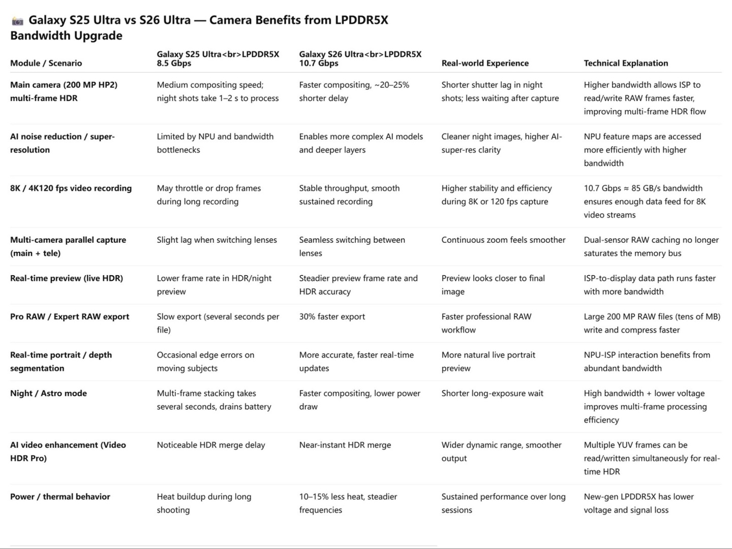 Notavelmente, essas são as mesmas configurações de RAM da série Galaxy S25, embora não haja mais opções de armazenamento de 128 GB. Parece que a Samsung decidiu não aumentar a capacidade de RAM para a série Galaxy S26. Dito isso, o mesmo vazador havia mencionado na semana passada que a memória LPDDR5X funciona em velocidades mais altas de 10,7 Gbps, em comparação com 8,5 Gbps na geração atual. Isso permitirá um processamento mais rápido de fotos noturnas, menos ruído em fotos com pouca luz, melhor faixa dinâmica em vídeo Pro, bem como algumas outras melhorias na câmera.