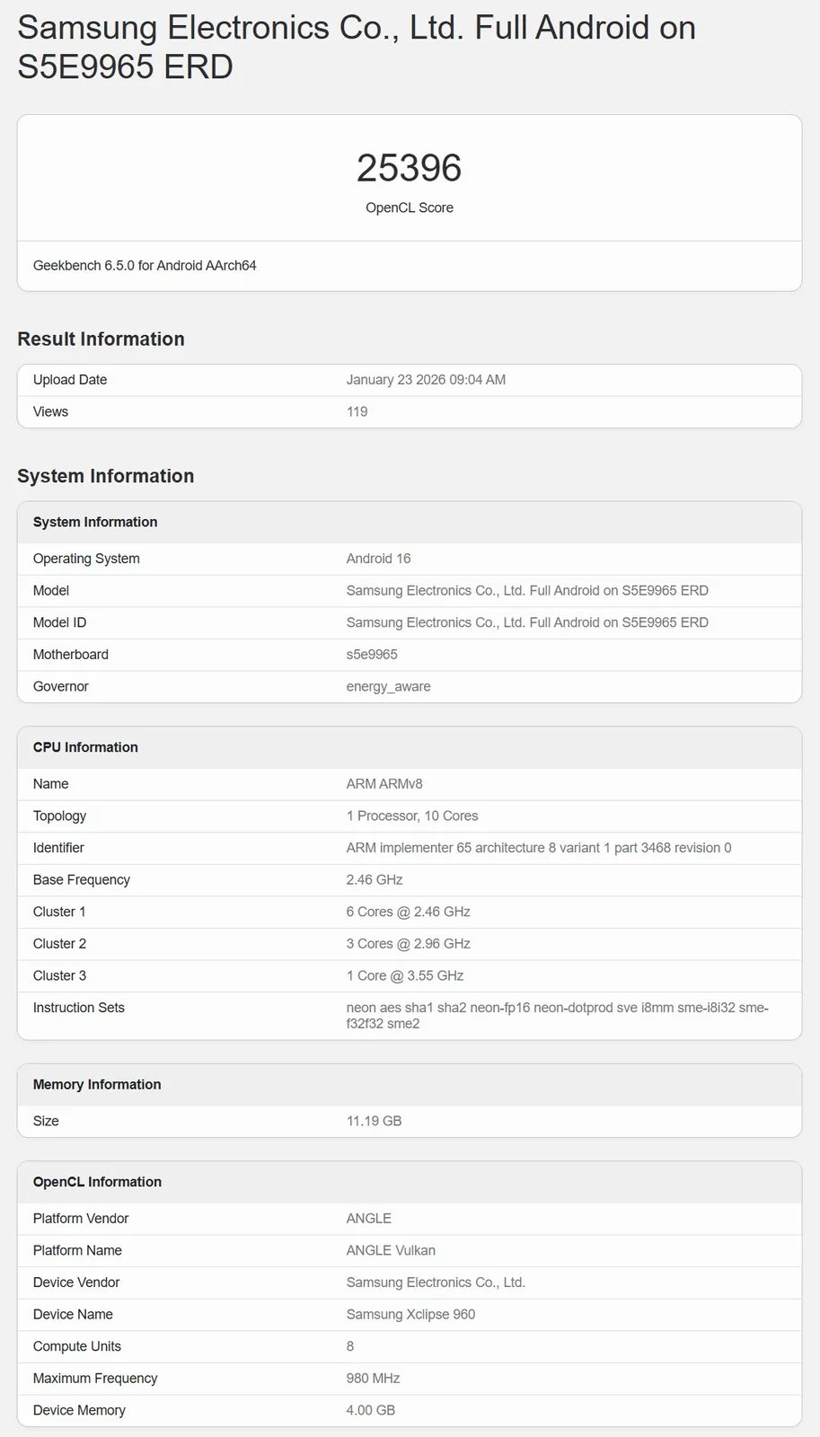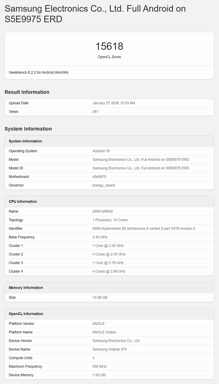Se o modelo com o número S5E9975 ERD for de fato um sistema de teste da Samsung para o sucessor do Exynos 2600ele está tendo um desempenho muito ruim. O desempenho da GPU foi medido aqui, que, como esperado, é um Samsung Xclipse 970 e, de acordo com o Geekbench, é equipado com 4 unidades de computação a uma velocidade de clock de 555 MHz. Isso é aproximadamente a metade e a metade da velocidade do sistema de teste do Exynos 2600, que já fez sua marca no Geekbench várias vezes. Considerando que a GPU tem apenas metade da potência, o resultado de 15.618 pontos no teste OpenCL não é tão ruim, mas, é claro, ainda está significativamente abaixo do nível do sistema de teste Exynos 2600